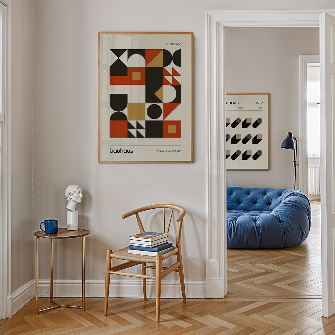 Esta pared artística Bauhaus ofrece una elegante geometría donde cada póster interactúa cuidadosamente con el siguiente, aportando a la habitación una expresión sofisticada y moderna. Los colores combinan sutilmente tonos terrosos y atrevidos, creando una atmósfera cálida y refrescante. Estos pósteres transforman la superficie de la pared en una obra de arte que inspira y llena la habitación de armonía.