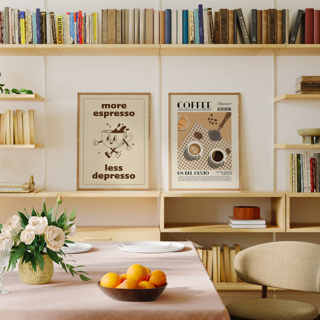 Esta pared artística combina alegría y elegancia con sus elegantes motivos de café, donde sutiles tonos tierra e ilustraciones creativas se combinan para crear un ambiente acogedor. Los contrastes equilibrados y la agradable paleta de colores realzan la atmósfera acogedora de la habitación y la convierten en el complemento perfecto para realzar tu entorno cotidiano con un toque de estilo y encanto.