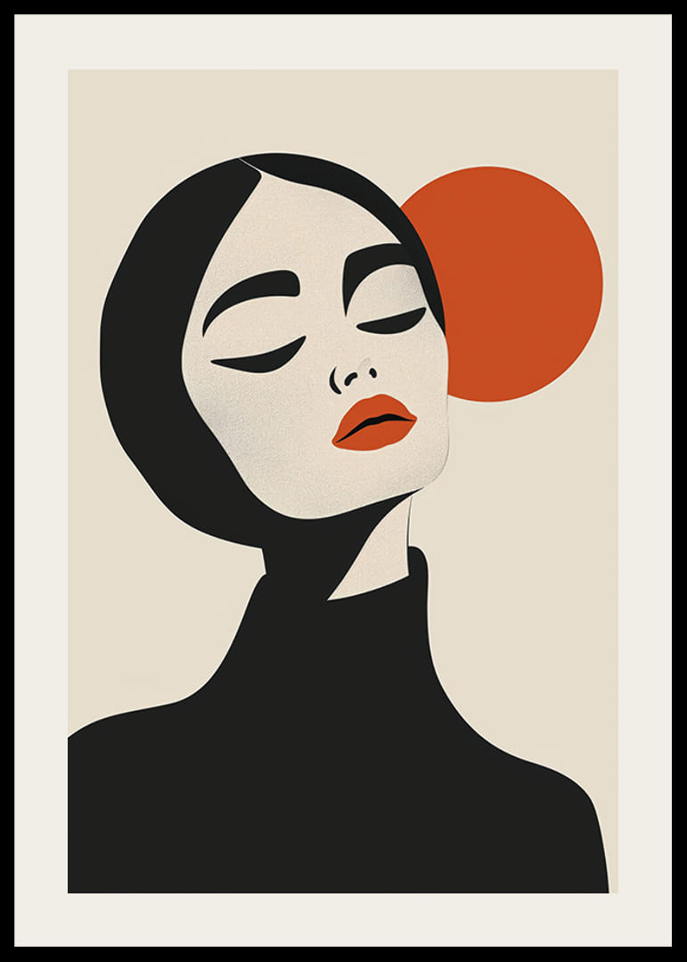 Este cartel capta tu atención con su elegante retrato de una mujer, rodeada de atrevidas líneas negras y un llamativo círculo naranja que parece flotar detrás de ella. El diseño minimalista y el sutil contraste entre colores crean una sensación de misterio y elegancia.