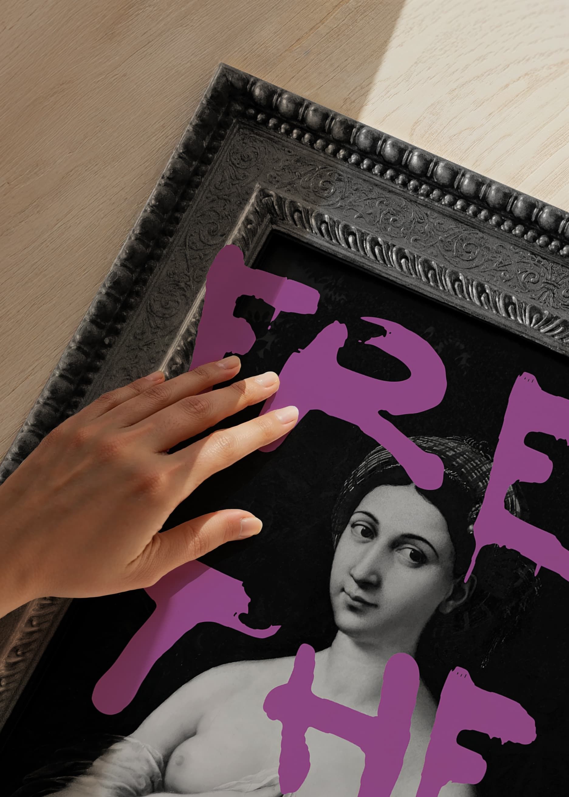 Este cartel llama la atención por su audaz combinación de arte clásico y mensajes modernos. La imagen renacentista en blanco y negro contrasta con el fuerte texto morado “Free the Nipple”, creando una composición poderosa y que invita a la reflexión.