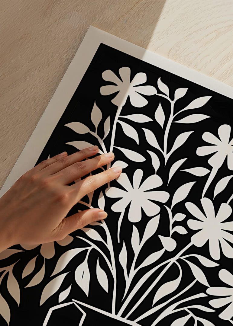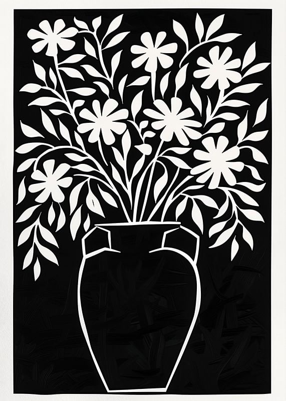Este cartel llama la atención inmediatamente por su estilo contrastante en blanco y negro. Las plantas en el jarrón destilan elegancia y sencillez, donde cada línea y forma crea un equilibrio armonioso.