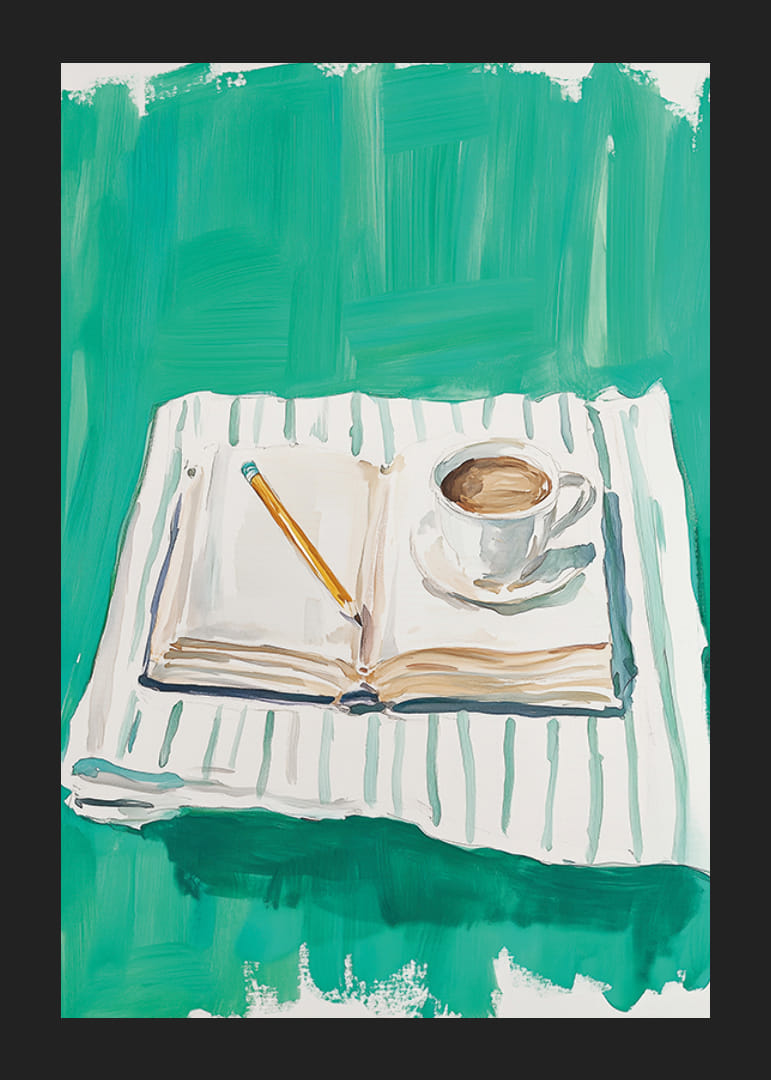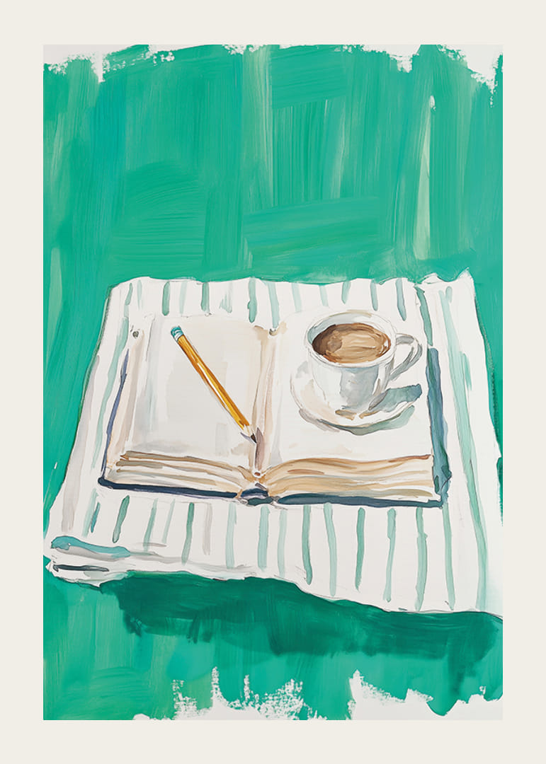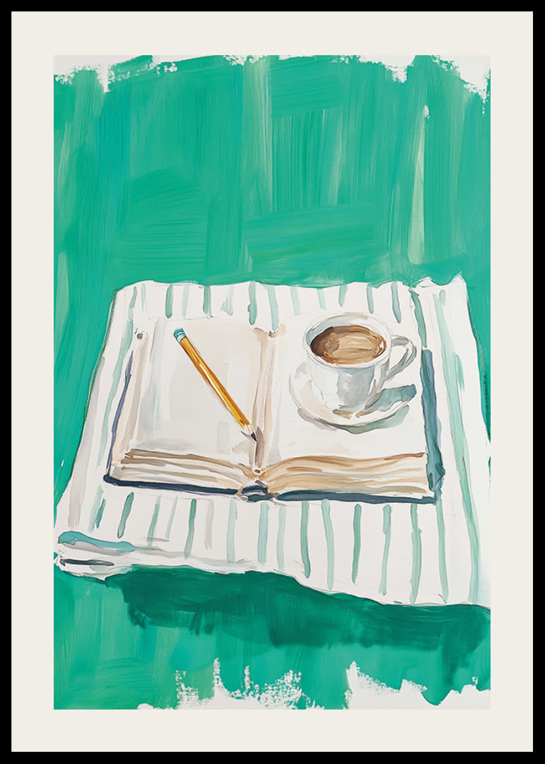 Este cartel captura un momento de paz con un libro abierto, un bolígrafo y una taza de café humeante sobre un fondo verde vibrante. Esta imagen evoca una sensación de calma y reflexión creativa, perfecta para quienes buscan un descanso del ajetreo y el bullicio de la vida cotidiana.