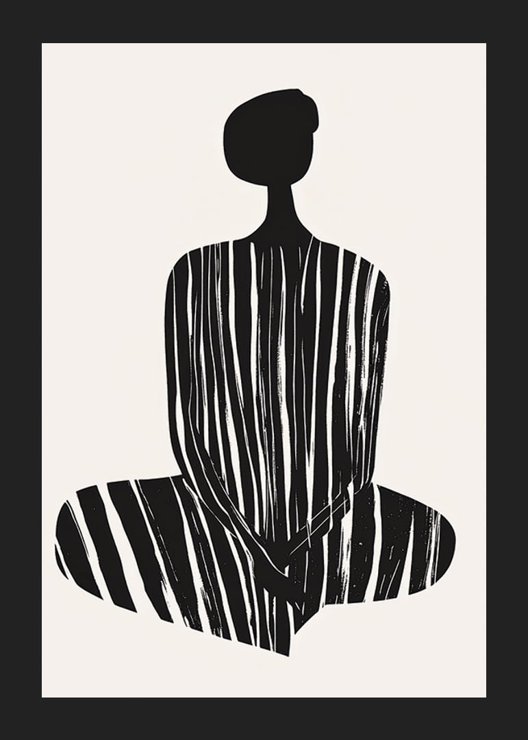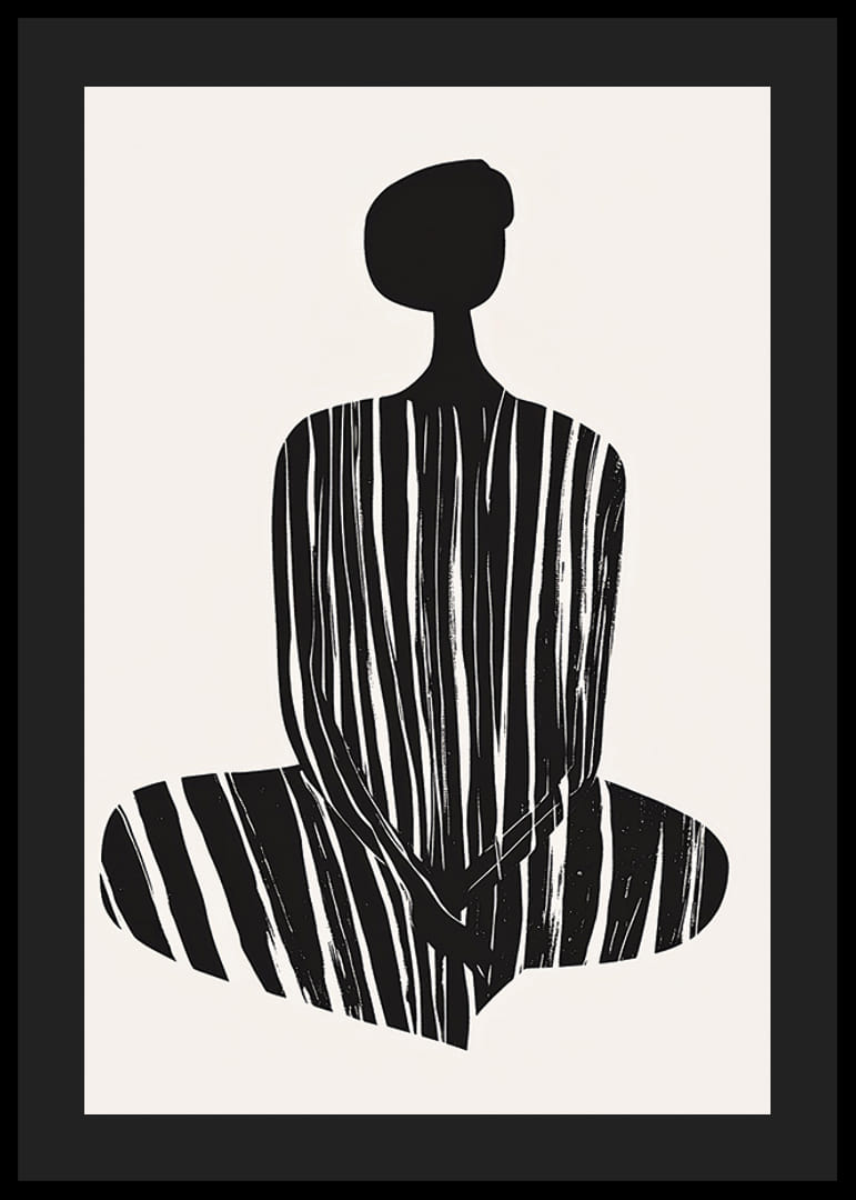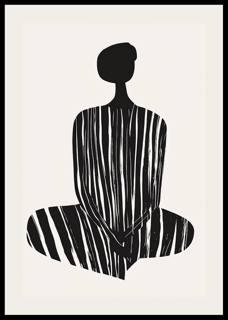 Este cartel captura una sensación de tranquilidad y armonía con su elegante diseño. La silueta de una figura meditativa se resalta mediante suaves rayas verticales en blanco y negro. El cartel ofrece una belleza minimalista que inspira reflexión y calma.