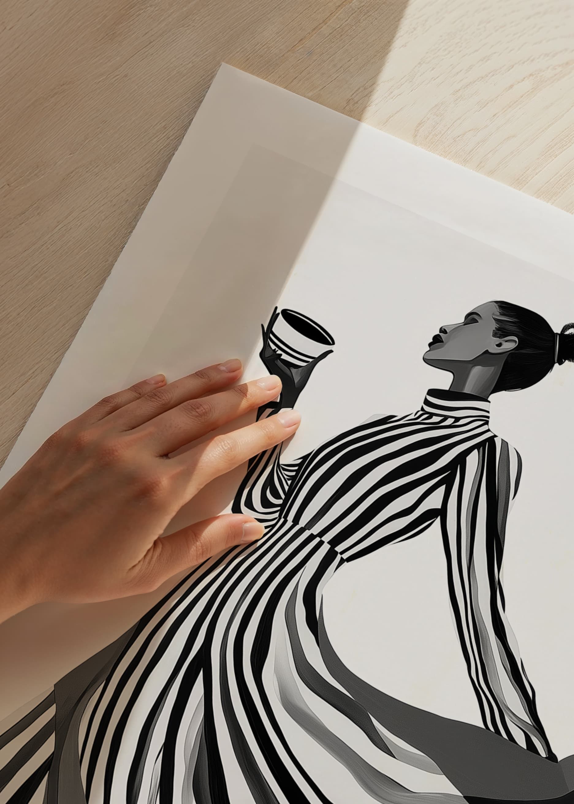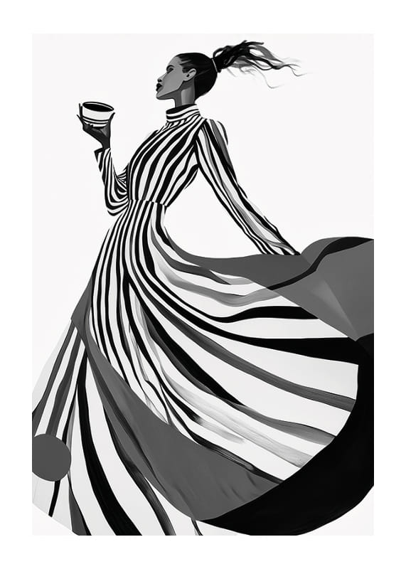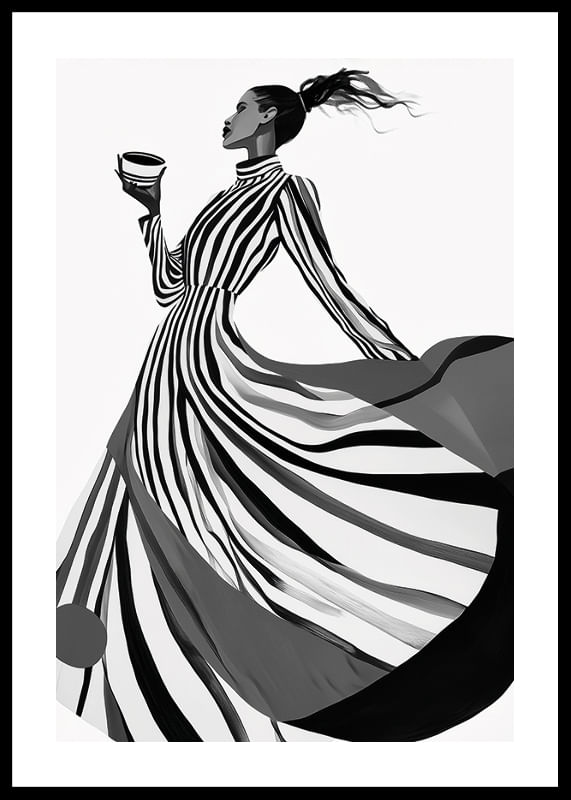 Este póster captura una silueta elegante, vestida con amplias rayas blancas y negras, evocando una sensación de estilo atemporal y sofisticación. El patrón de contraste sutil realza la impresión de movimiento y evoca una simplicidad inspiradora.