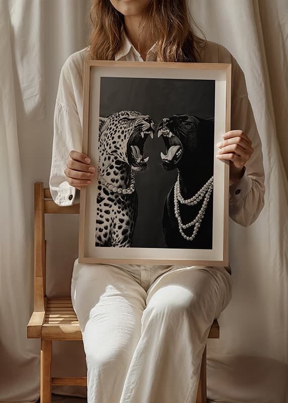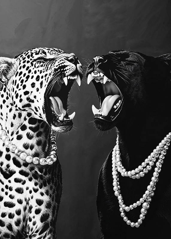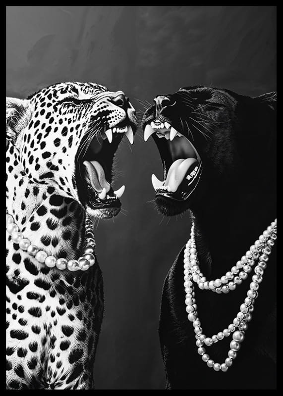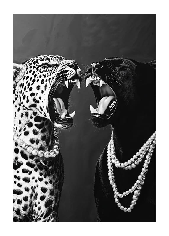 Este cartel captura a dos majestuosos depredadores en una pose poderosa, adornados con elegantes collares de perlas. La paleta de colores blanco y negro proporciona un contraste dramático que enfatiza la fuerza y ​​la elegancia de los animales. Las mandíbulas abiertas de los animales crean una sensación intensa y vívida.