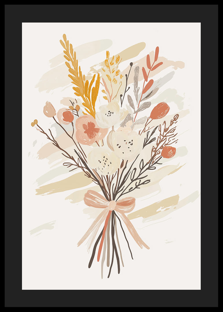 Este póster captura un elegante ramo en colores cálidos y terrosos que crean una atmósfera armoniosa. Las pinceladas suaves resaltan la belleza de las flores y dan una sensación de elegancia natural. Los detalles estilizados hacen que el motivo sea artístico y atemporal.