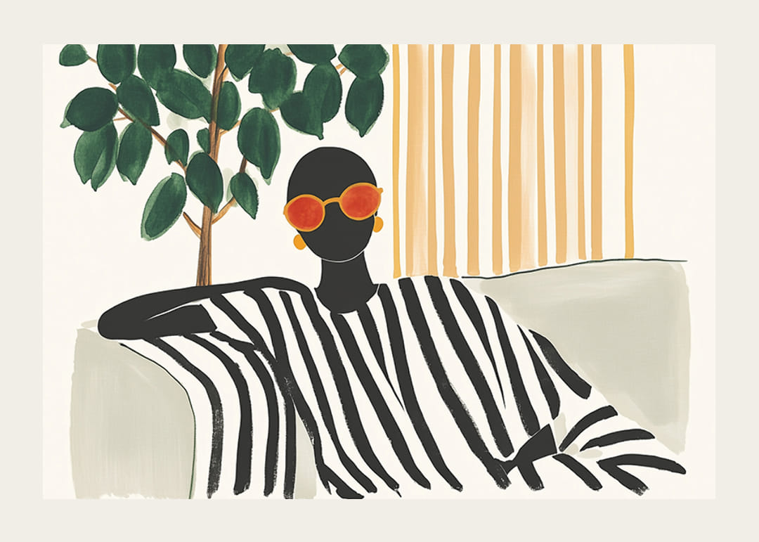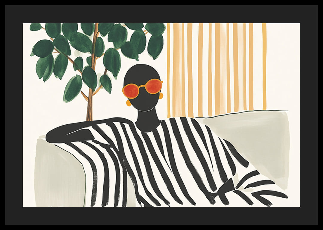 Este cartel captura una escena elegante y tranquila con una figura carismática vestida con atrevidas rayas blancas y negras, sentada relajadamente. Los vasos de color naranja aportan un toque de color de buen gusto, mientras que las hojas verdes y los detalles de madera crean equilibrio y naturalidad.