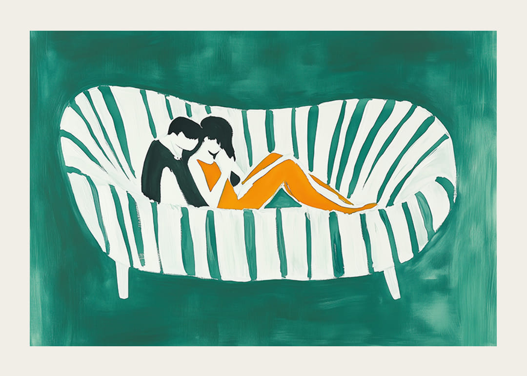 En el centro de este cartel, dos individuos se encuentran en un cálido y amoroso abrazo, sentados uno cerca del otro en un elegante sofá a rayas. Los colores vibrantes del naranja y el verde contrastan armoniosamente, creando una atmósfera de calma e intimidad.