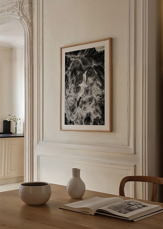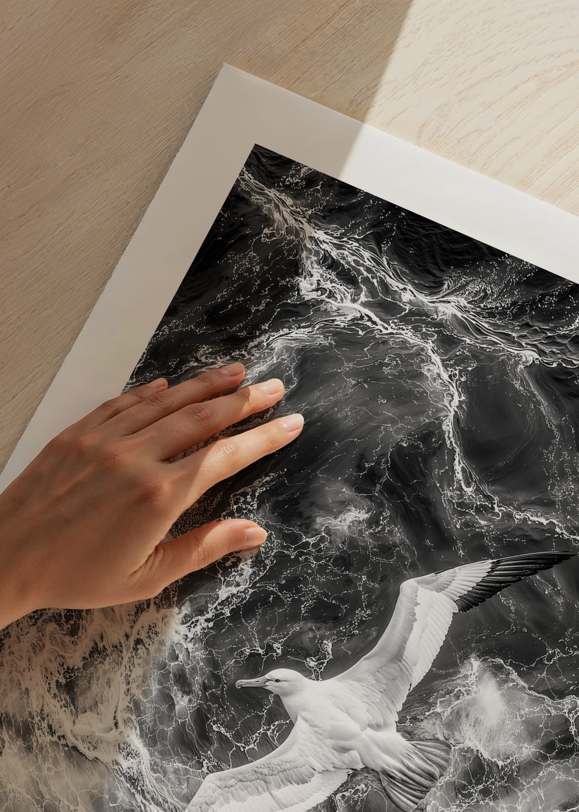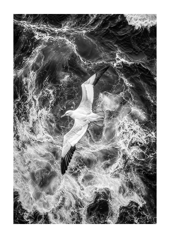 Este cartel captura un pájaro elegante volando sobre las poderosas y agitadas olas. La fotografía en blanco y negro realza el dramatismo y da un aura de atemporalidad y misterio. El movimiento del pájaro frente a la intensidad constante del mar simboliza la libertad y la fuerza.