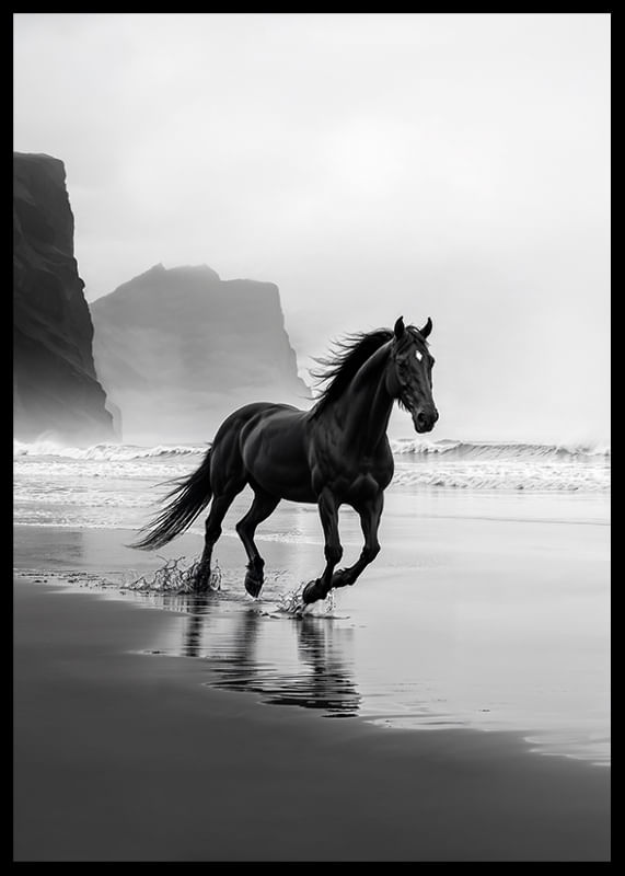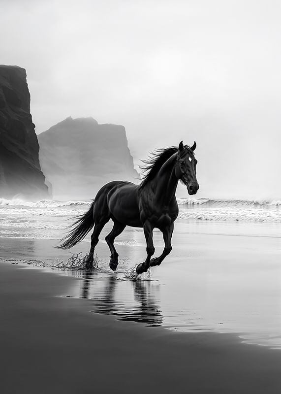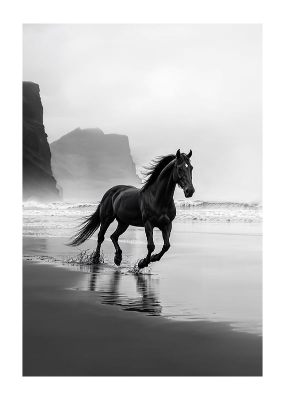 Este cartel captura la majestuosa belleza de un caballo negro galopando a lo largo de una costa brumosa. La potencia y la elegancia del caballo contrastan con el fondo suave y difuminado del mar y las rocas, creando una sensación de misterio y libertad.