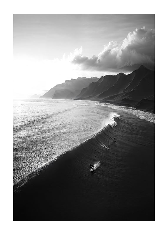 Este póster en blanco y negro captura la impresionante belleza de los surfistas dominando poderosas olas frente a una costa espectacular. La luz y las sombras crean una atmósfera majestuosa donde el poder de la naturaleza y el esfuerzo humano se encuentran en armonía.