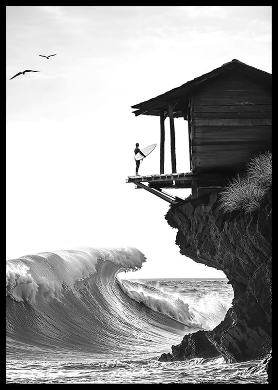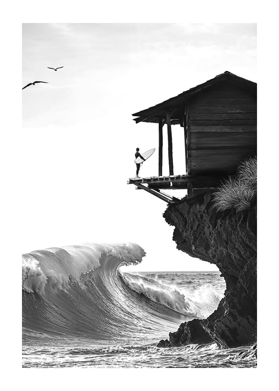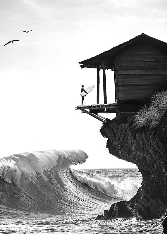 En el escarpado acantilado del océano se encuentra un valiente surfista, atrapado en medio de un momento de tranquila preparación antes de la aventura. La poderosa ola avanza, su poder y belleza capturados en este póster en blanco y negro.
