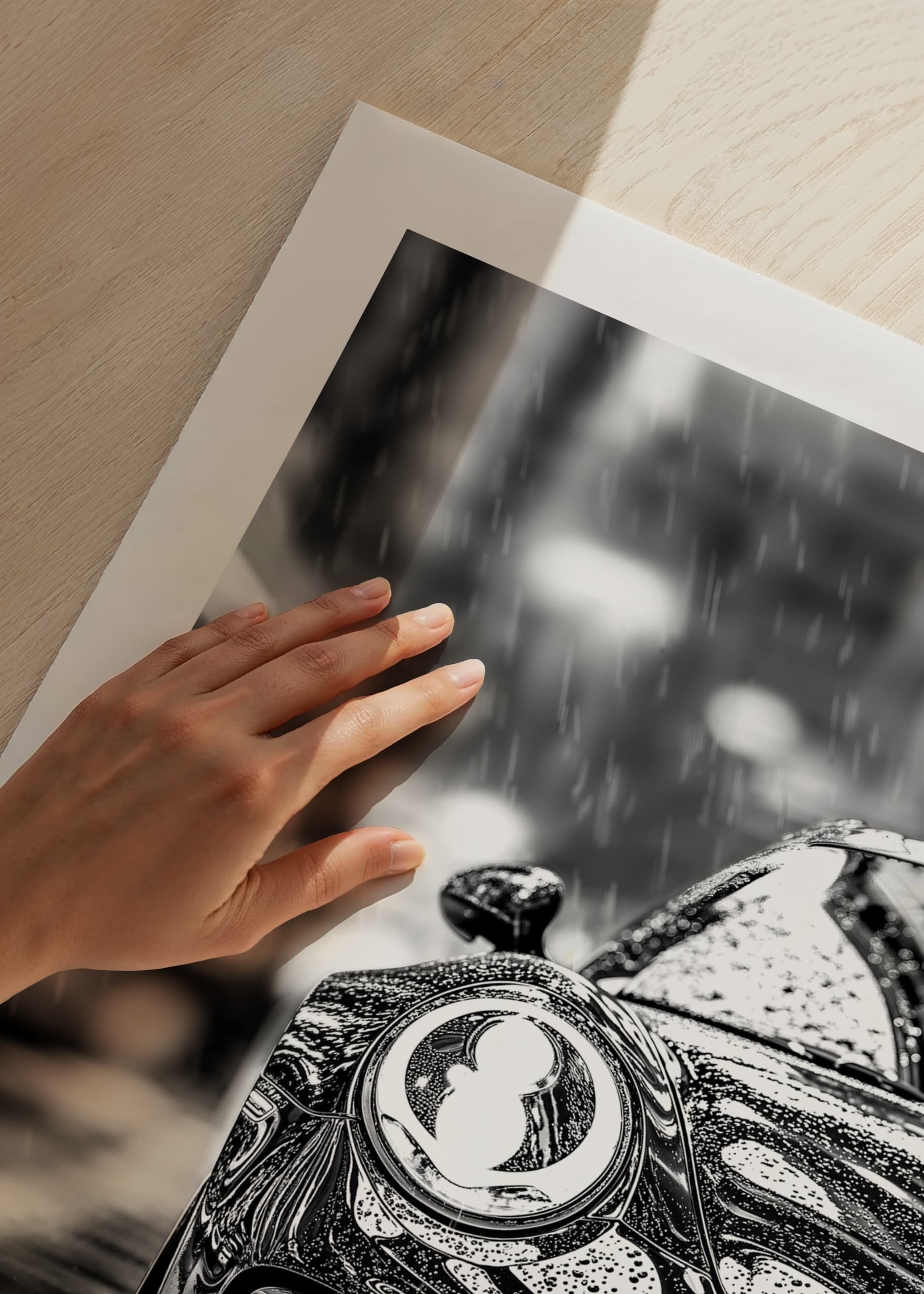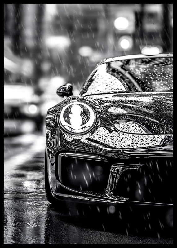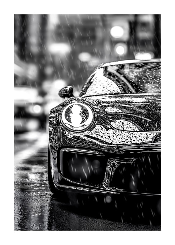 Este cartel captura la elegancia cruda de un automóvil frente al dramático espectáculo de la lluvia en la ciudad. La expresión monocromática resalta las líneas brillantes de la carrocería y la danza de la luz sobre la superficie húmeda.