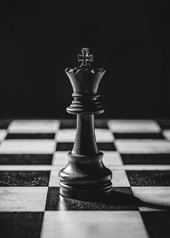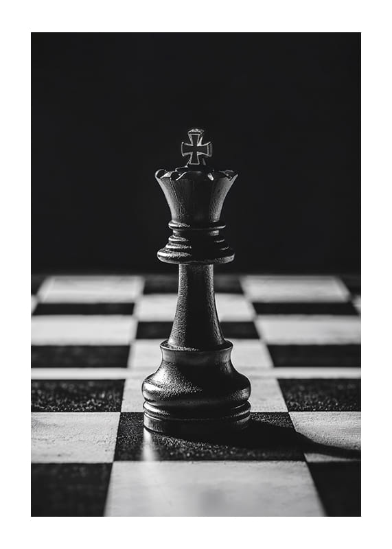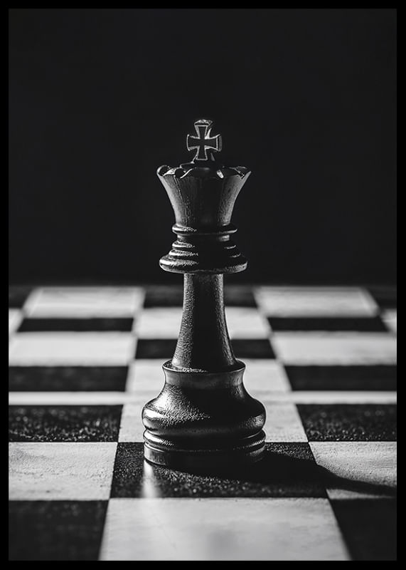Este cartel captura una instantánea del dominio del rey del ajedrez sobre el tablero, con poderosos contrastes entre luz y sombra. Los detalles del rey enfatizan la fuerza y ​​el liderazgo, dando una sensación de estrategia y reflexión.
