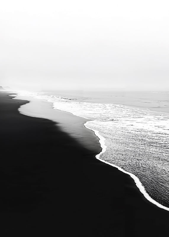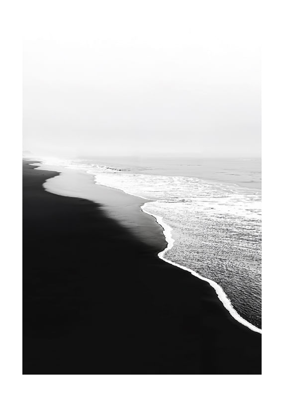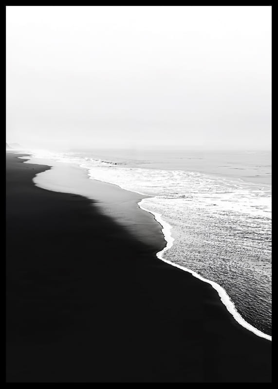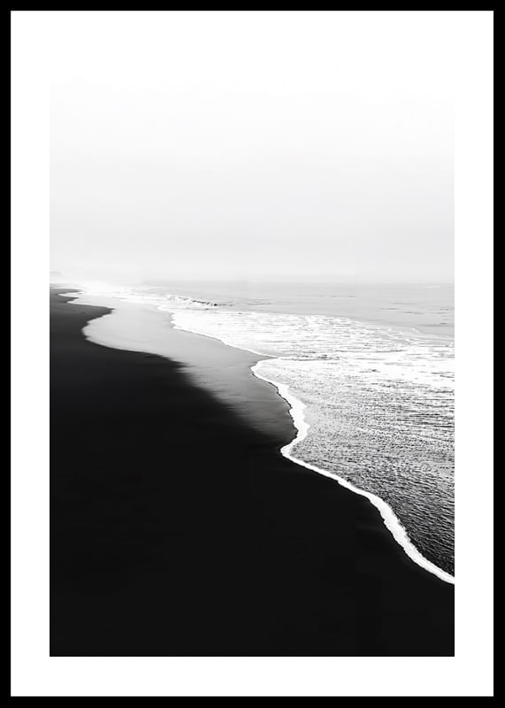 Un póster visualmente impactante que captura los contrastes entre la playa de arena negra y las espumosas olas blancas del océano. Es una imagen de quietud y movimiento, donde los elementos se encuentran en una danza armoniosa.