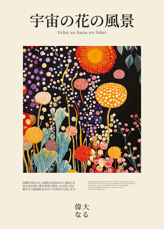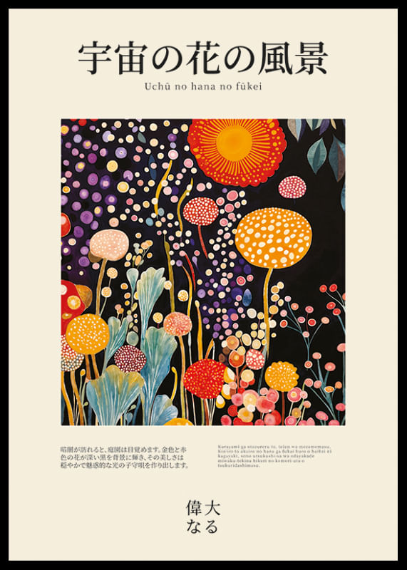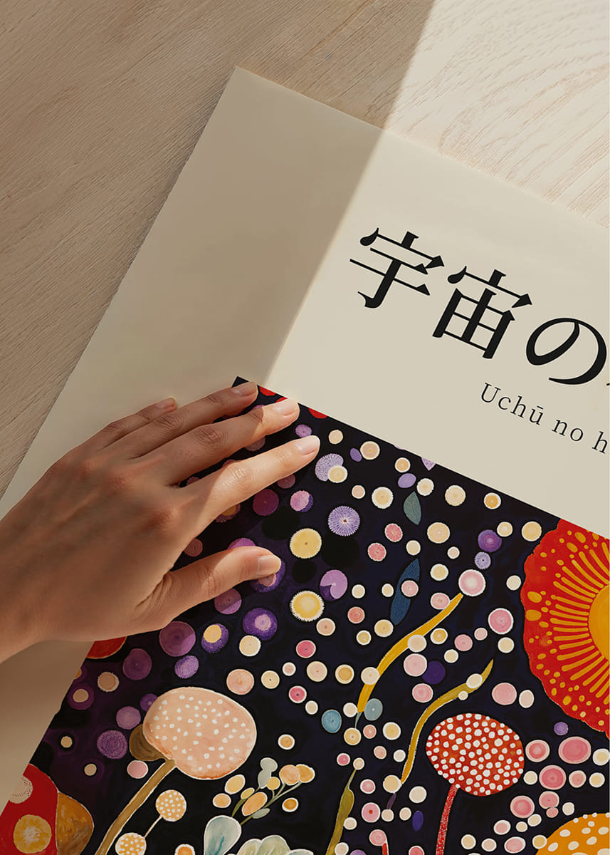 Póster Japandi inspirado en la artista japonesa Yayoi Kusama. Colores vibrantes y flores imaginativas dan vida a este cartel, donde un mundo de ensueño de jardines cósmicos se abre ante los ojos del espectador. Al combinar misterio y belleza, este cartel ofrece una sensación de escape de la vida cotidiana y crea una atmósfera de calma y fascinación.