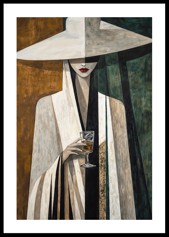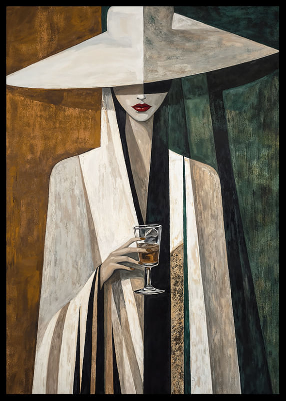 Este cartel Japandi llama la atención inmediatamente por su elegancia misteriosa y su estilo atemporal. Una figura femenina medio oculta bajo un gran sombrero, vestida con una túnica blanca y con una bebida lujosa en la mano. Los colores intensos y el juego de sombras dan una sensación de misterio sofisticado.