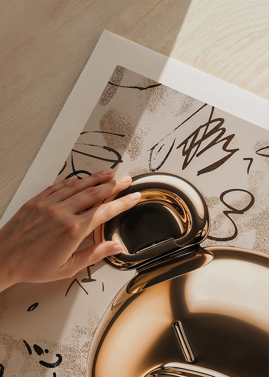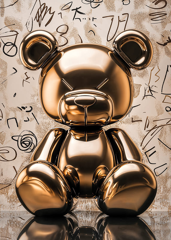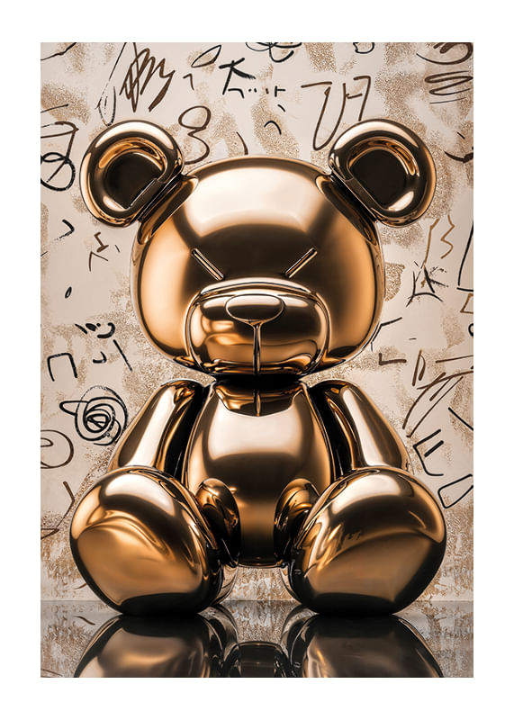 Este póster captura un animal de juguete dorado en un acabado brillante que brinda una sensación de elegancia moderna y alegría. La superficie reflectante de la figura crea un contraste cautivador con el fondo artístico lleno de patrones abstractos.