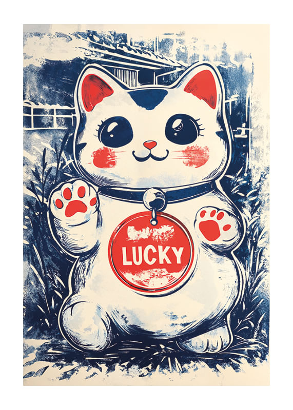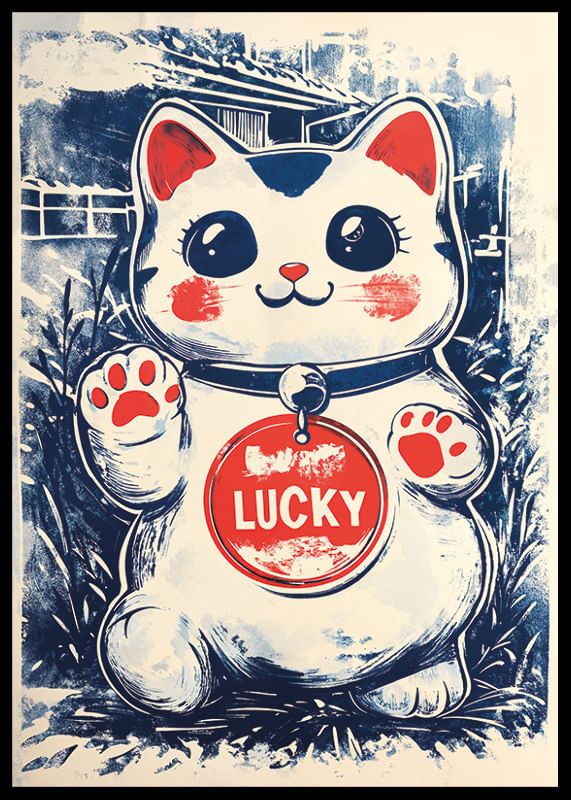 Este póster Japandi está adornado con un encantador gato de la suerte, cuyos grandes ojos y expresión juguetona le dan a la habitación una sensación de alegría y positividad. Los colores del cartel, con suaves matices azules y rojos cálidos, se complementan de forma armoniosa, creando una atmósfera visualmente atractiva.