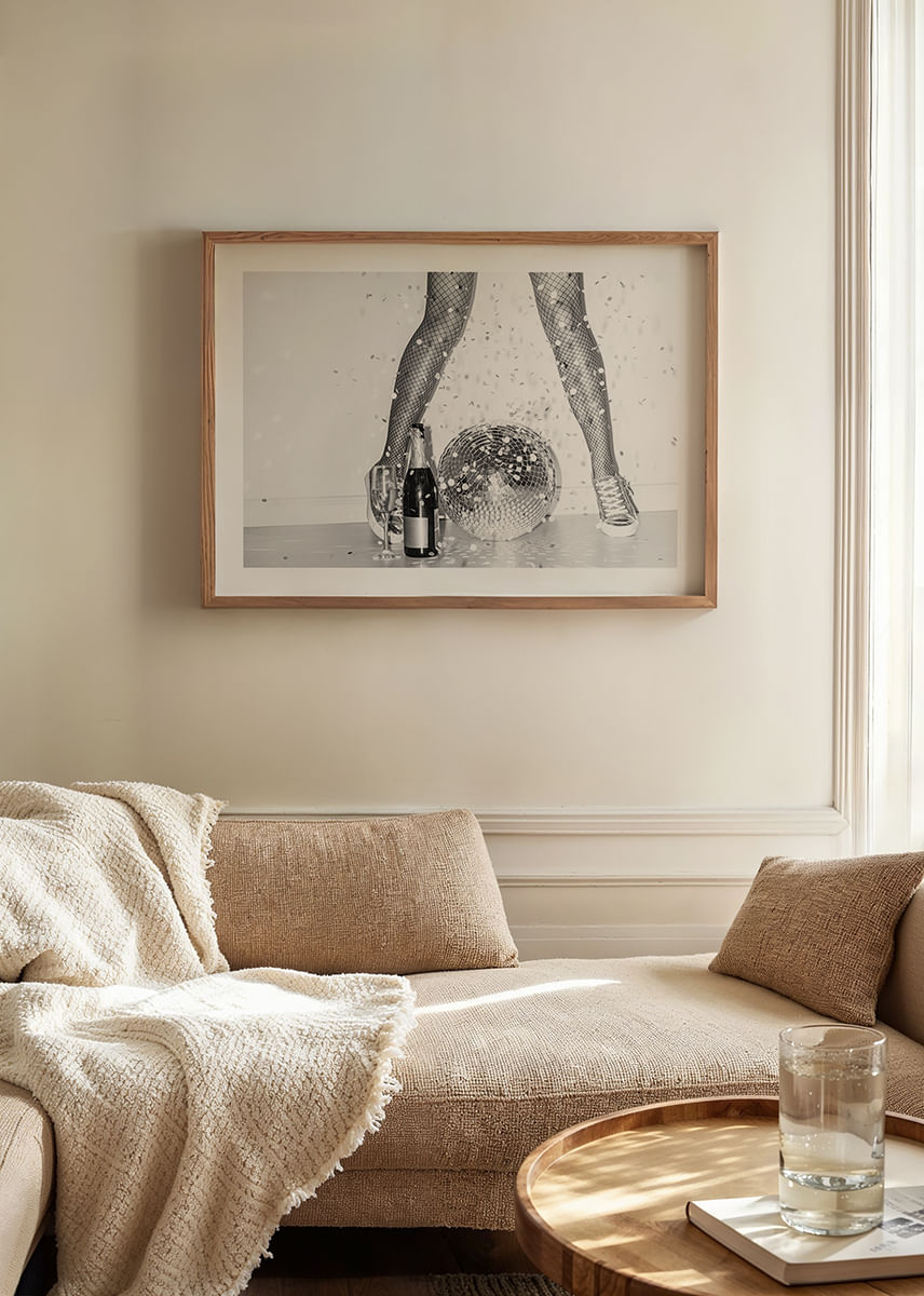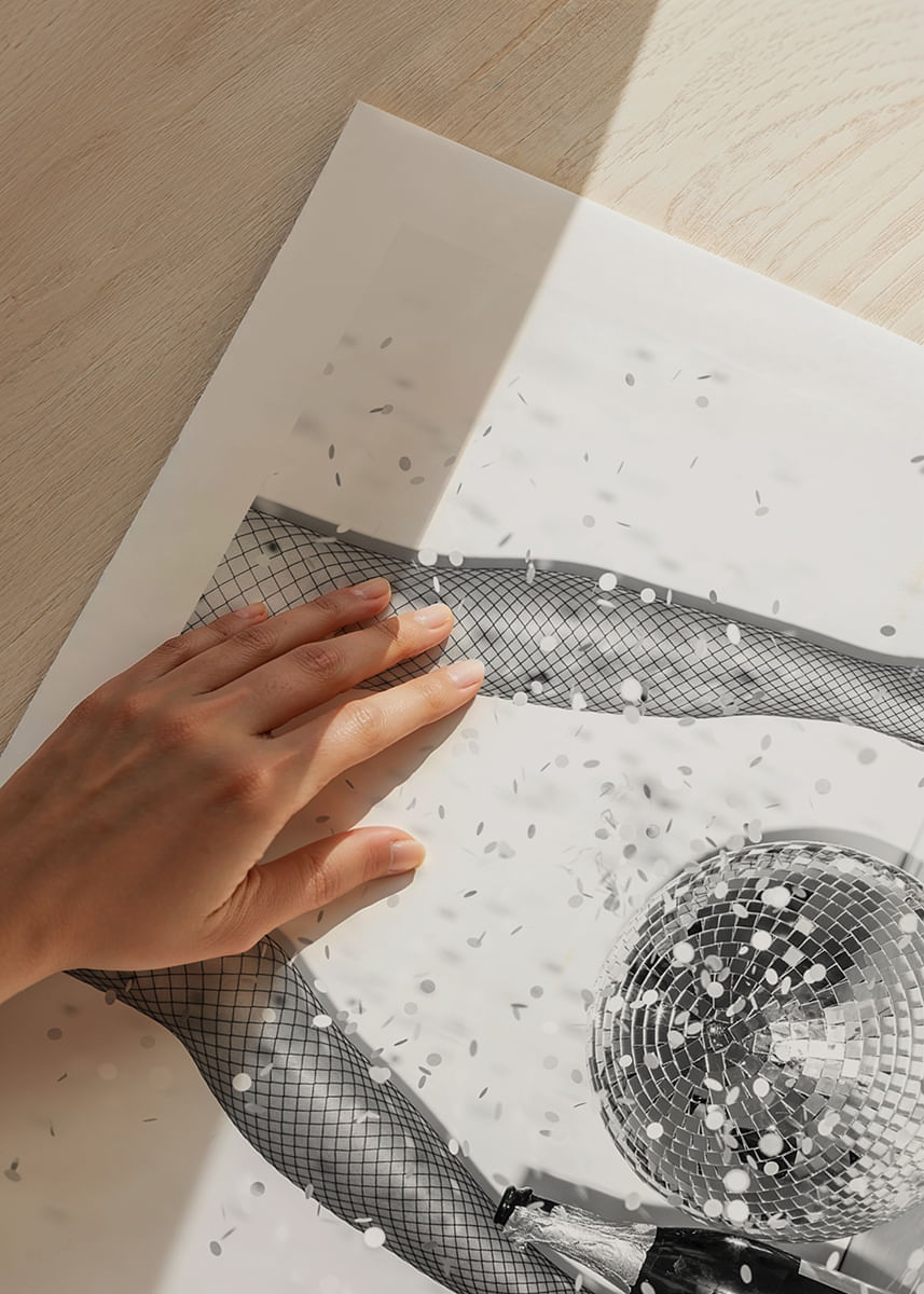 Este cartel captura el momento de elegancia y ambiente festivo. Medias de rejilla y zapatos brillantes abrazan una bola de espejos, mientras cae confeti, creando una atmósfera de pura alegría y lujo.