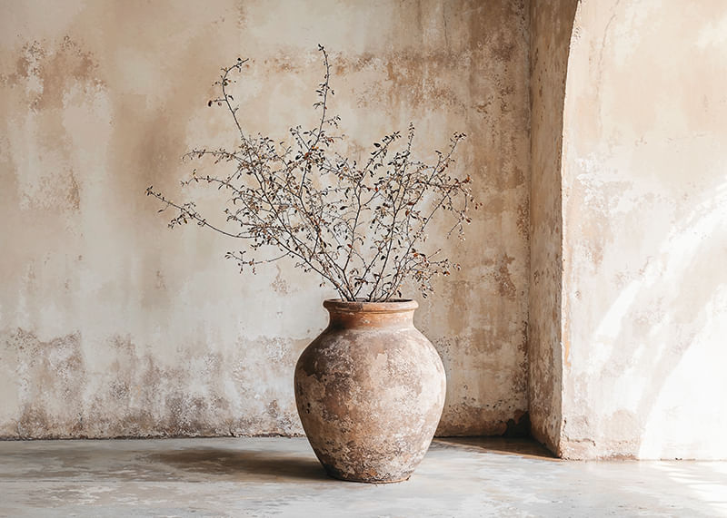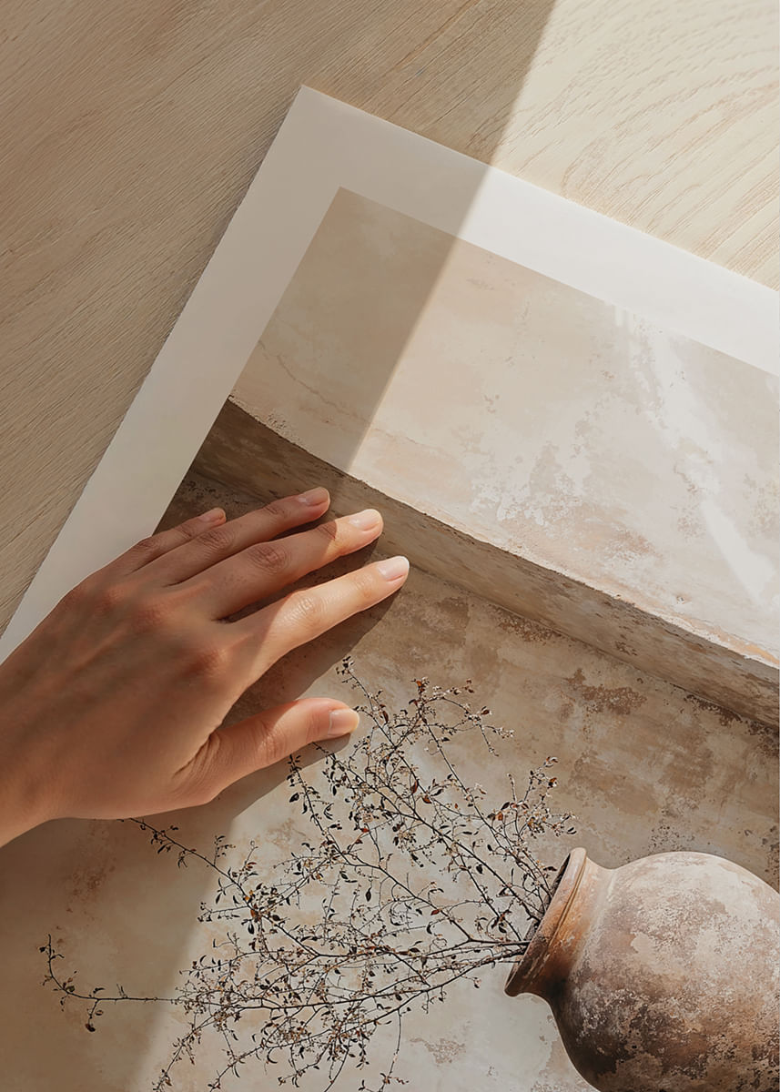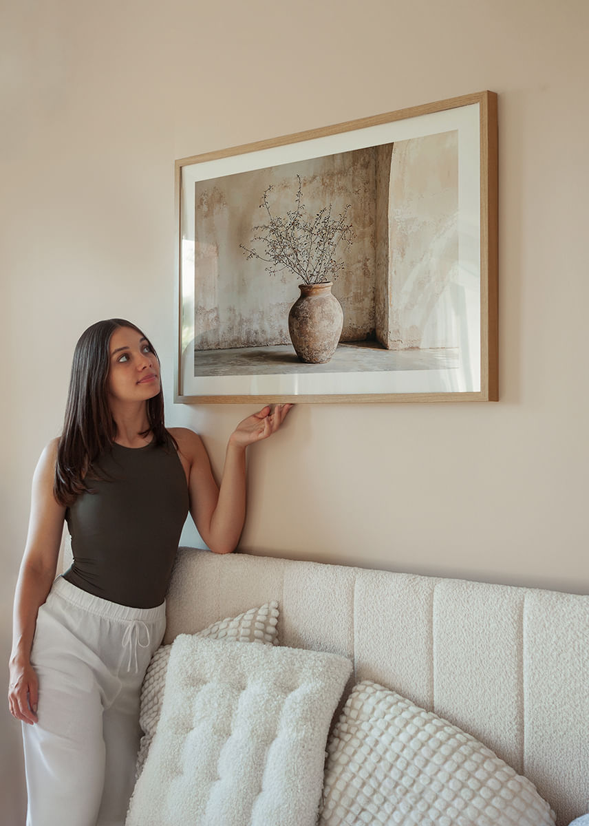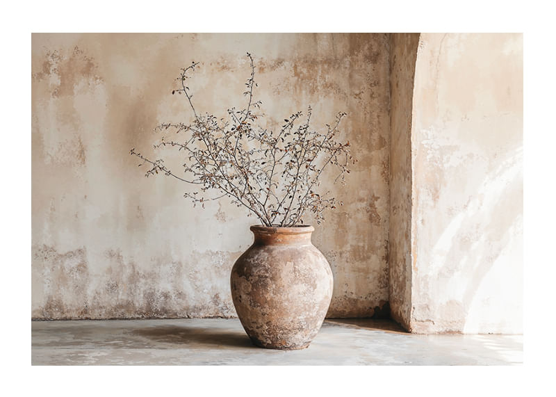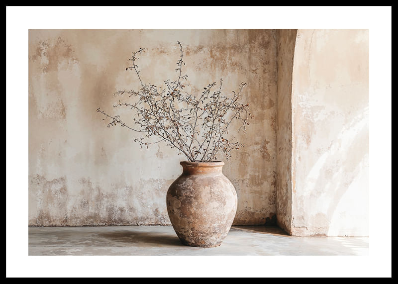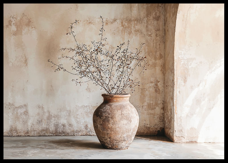 Este cartel captura una sensación de atemporalidad a través de una maceta rústica llena de ramitas frágiles, con el telón de fondo de una pared suavemente patinada. Los tonos tierra suaves crean una atmósfera tranquila que resalta la belleza natural de la habitación.