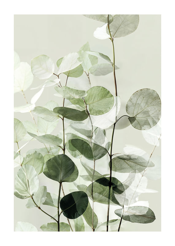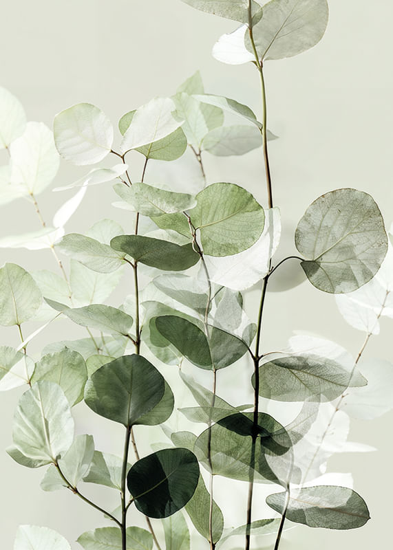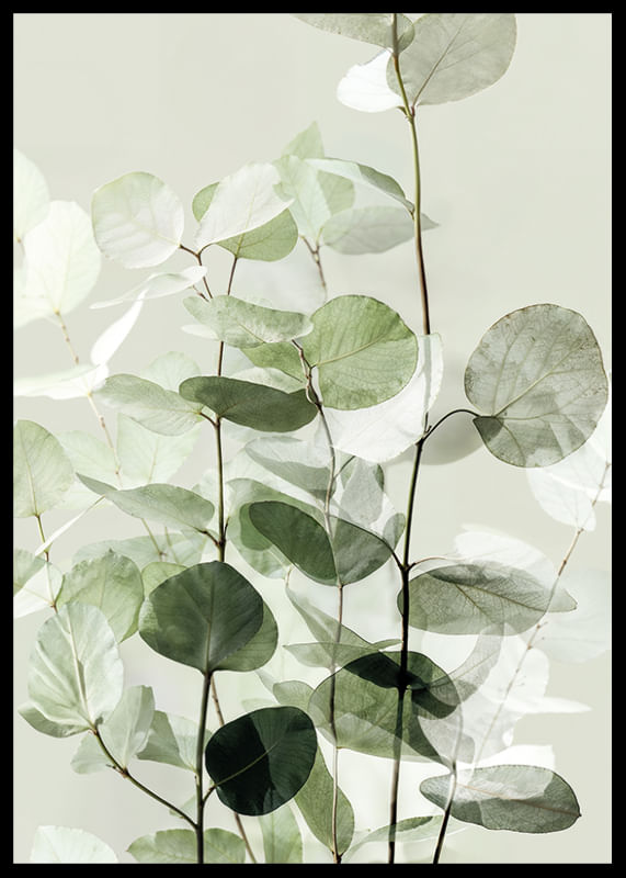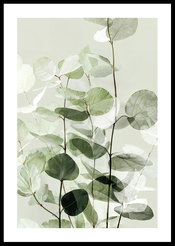Este cartel captura el encuentro pacífico entre la luz y el follaje, donde cada tono de verde se fusiona en una danza armoniosa. La estructura pura de las hojas sobre un fondo suave crea una sensación de paz y tranquilidad.