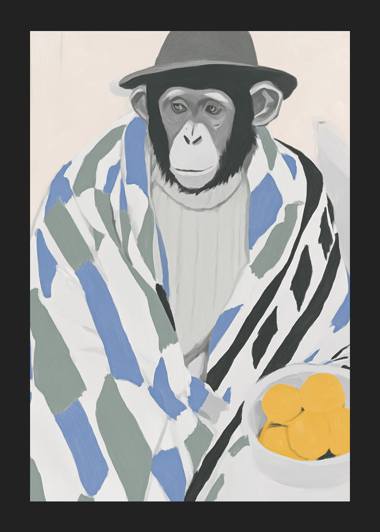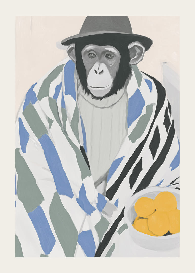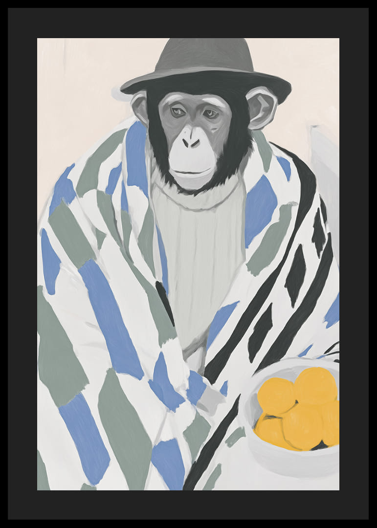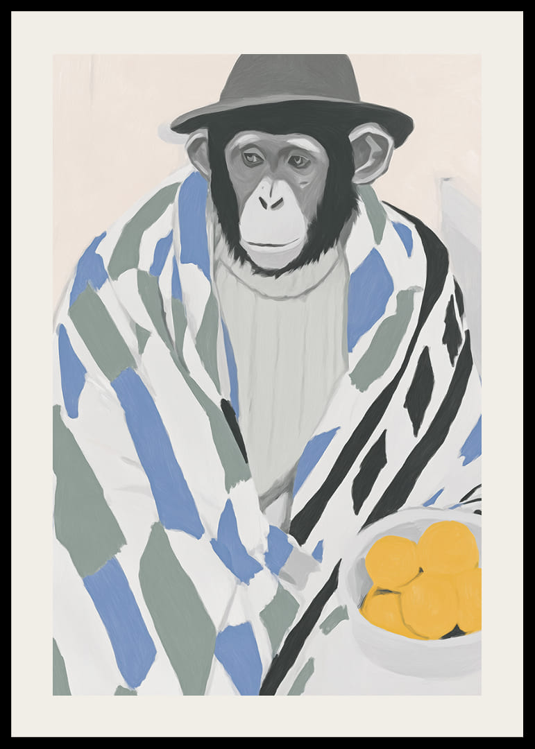 Este póster atrae la atención con un mono encantadoramente vestido y envuelto en una manta estampada, que transmite una sensación de calma y reflexión. El discreto toque del sombrero y el cuenco de limones amarillos brillantes crean un contraste armonioso y despiertan la curiosidad. Perfecto para añadir un ambiente artístico y lúdico a tu hogar, este póster es un estimulante que fascina e inspira los sentidos.