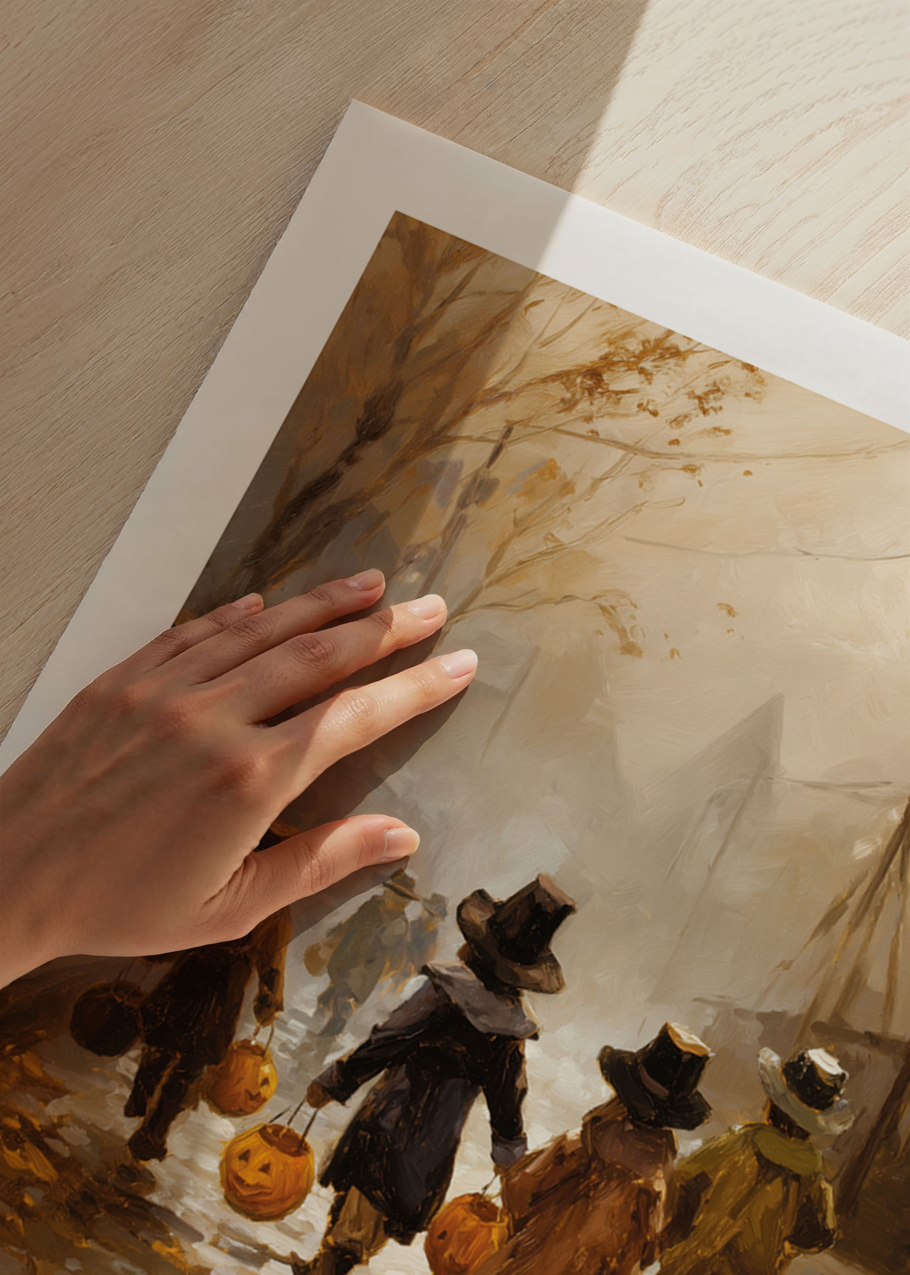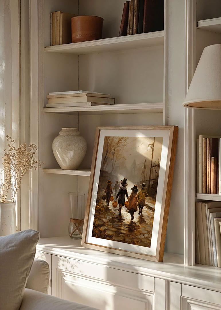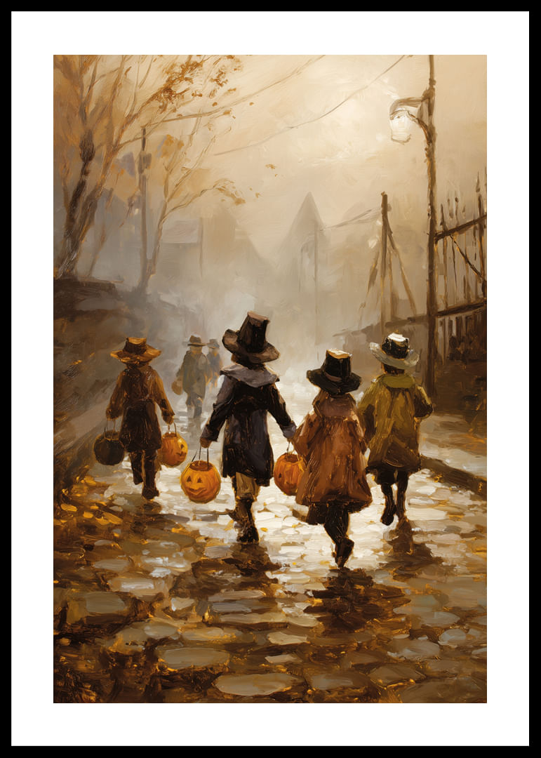 Una mágica tarde de otoño donde los niños pasean por calles empedradas con calabazas iluminadas en la mano. Sus risas resuenan bajo las antiguas farolas, envueltos en una atmósfera de misterio y encanto. Este póster no solo captura la belleza nostálgica de una época pasada, sino que también añade un toque rústico y acogedor a tu hogar, perfecto para dar la bienvenida al otoño.