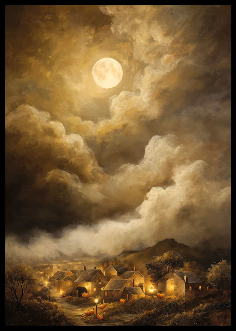 Sumérgete en el mundo onírico de este póster, donde una magnífica luz de luna ilumina un tranquilo pueblo. La atmósfera serena se ve realzada por las densas nubes que envuelven la luna y proyectan suaves sombras sobre las casas y el paisaje. El póster captura el misterio de la noche y transmite una sensación de paz y reflexión. Ideal para impregnar tu hogar con un ambiente relajante y meditativo.