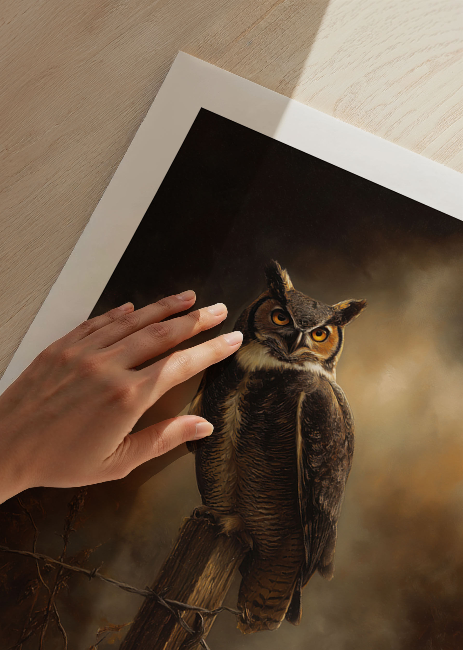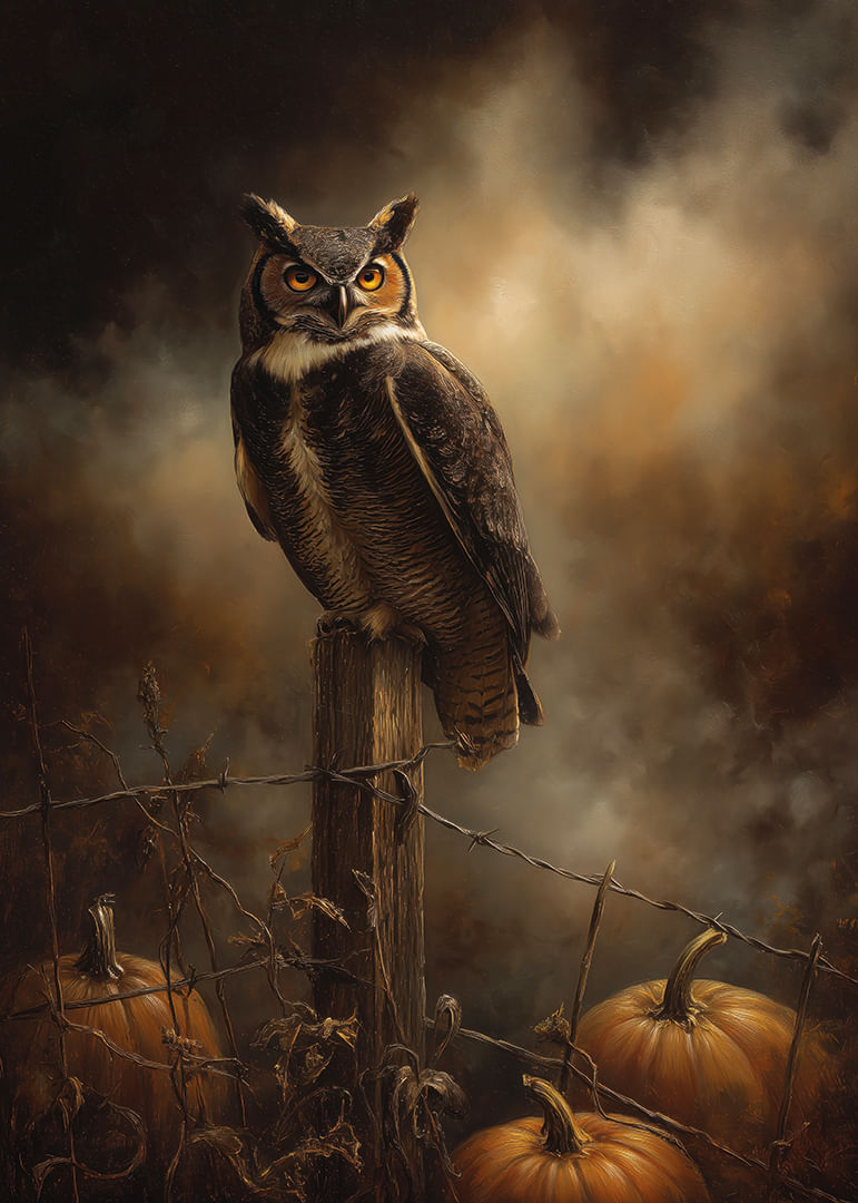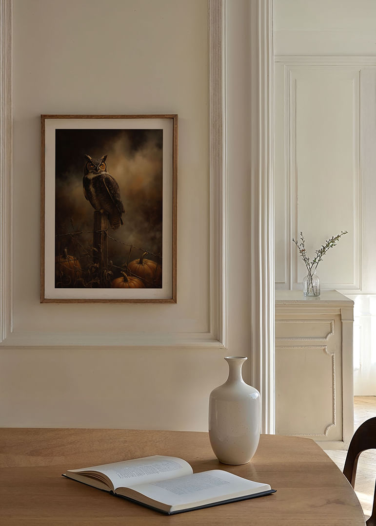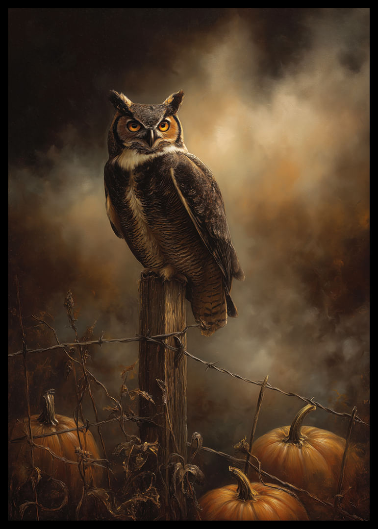 Este fascinante póster captura la majestuosidad de un búho posado en un poste de madera, rodeado de cálidos colores otoñales. La mirada intensa del búho y las calabazas resplandecientes crean una atmósfera misteriosa que transporta al espectador a otro mundo. La iluminación tenue y los tonos oscuros realzan el dramatismo de la imagen, convirtiendo este póster en el complemento perfecto para una habitación que busca un toque de misterio otoñal.