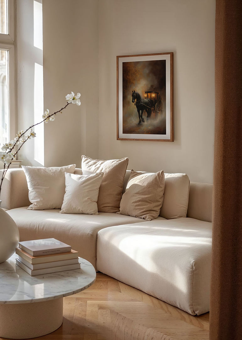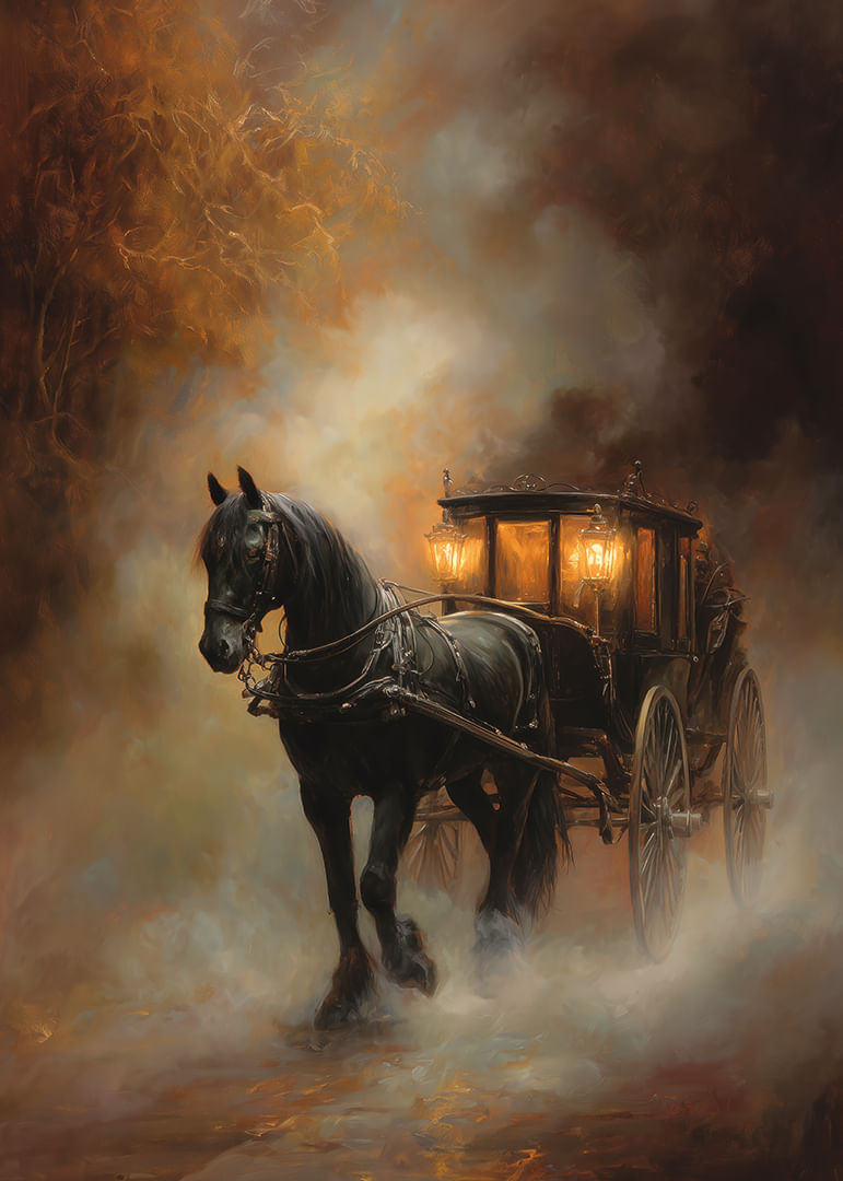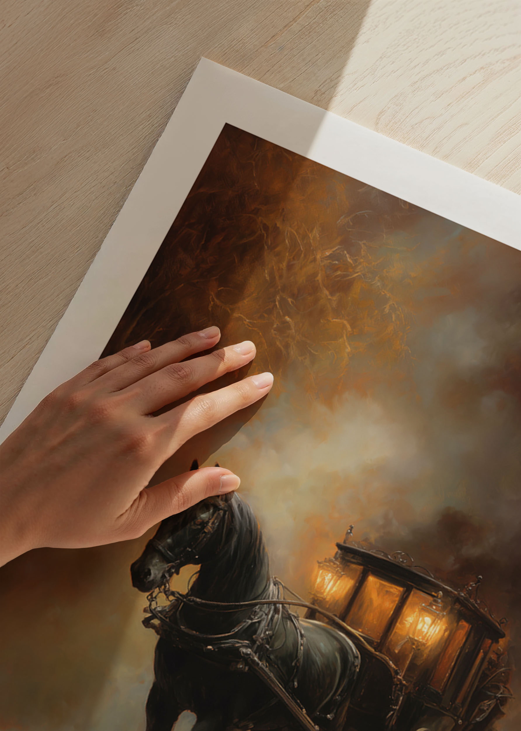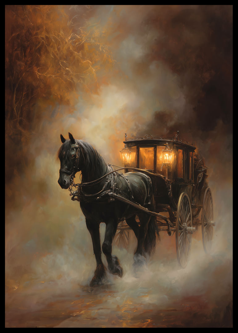 Con una mágica sensación de atemporalidad, la mirada se dirige al póster donde un majestuoso caballo tira de un elegante carruaje a través de la misteriosa niebla. La cálida luz de las linternas ilumina el entorno y crea una atmósfera de paz. Esta luz cálida realza la belleza del bosque, intensificando su atmósfera misteriosa. Este póster aporta elegancia a cualquier habitación y convierte tu pared en una obra de arte.