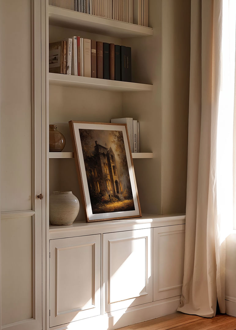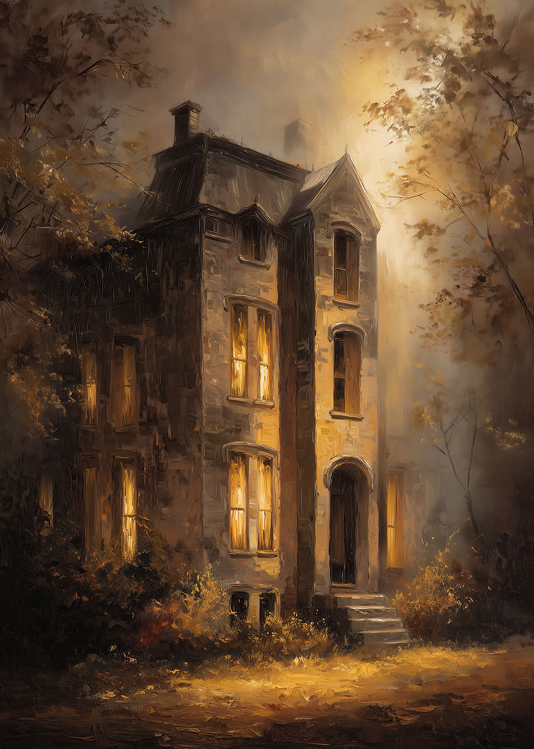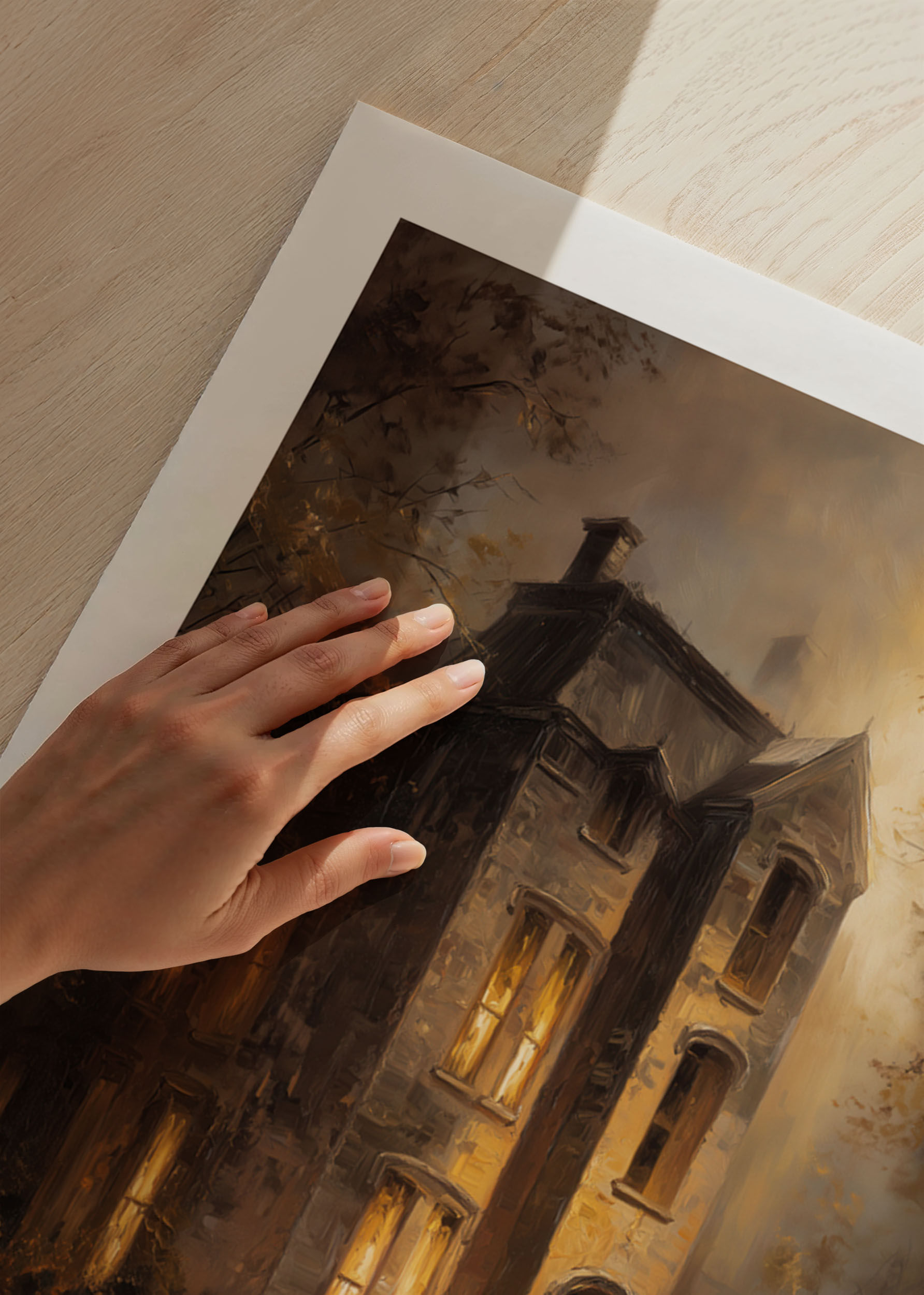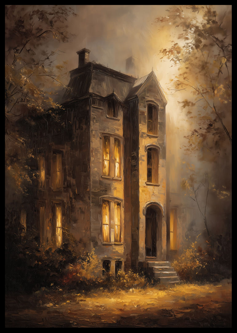 Este póster captura una misteriosa mansión bañada por la luz dorada del crepúsculo, donde la luz y las sombras danzan sobre la antigua fachada. Con una iluminación ambiental, se crea una atmósfera de tranquilidad y misterio. Los colores realzan la elegancia y el enigma de la estancia, convirtiendo este póster en un tema de conversación perfecto que transformará cualquier habitación en un lugar de ensueño e imaginación.