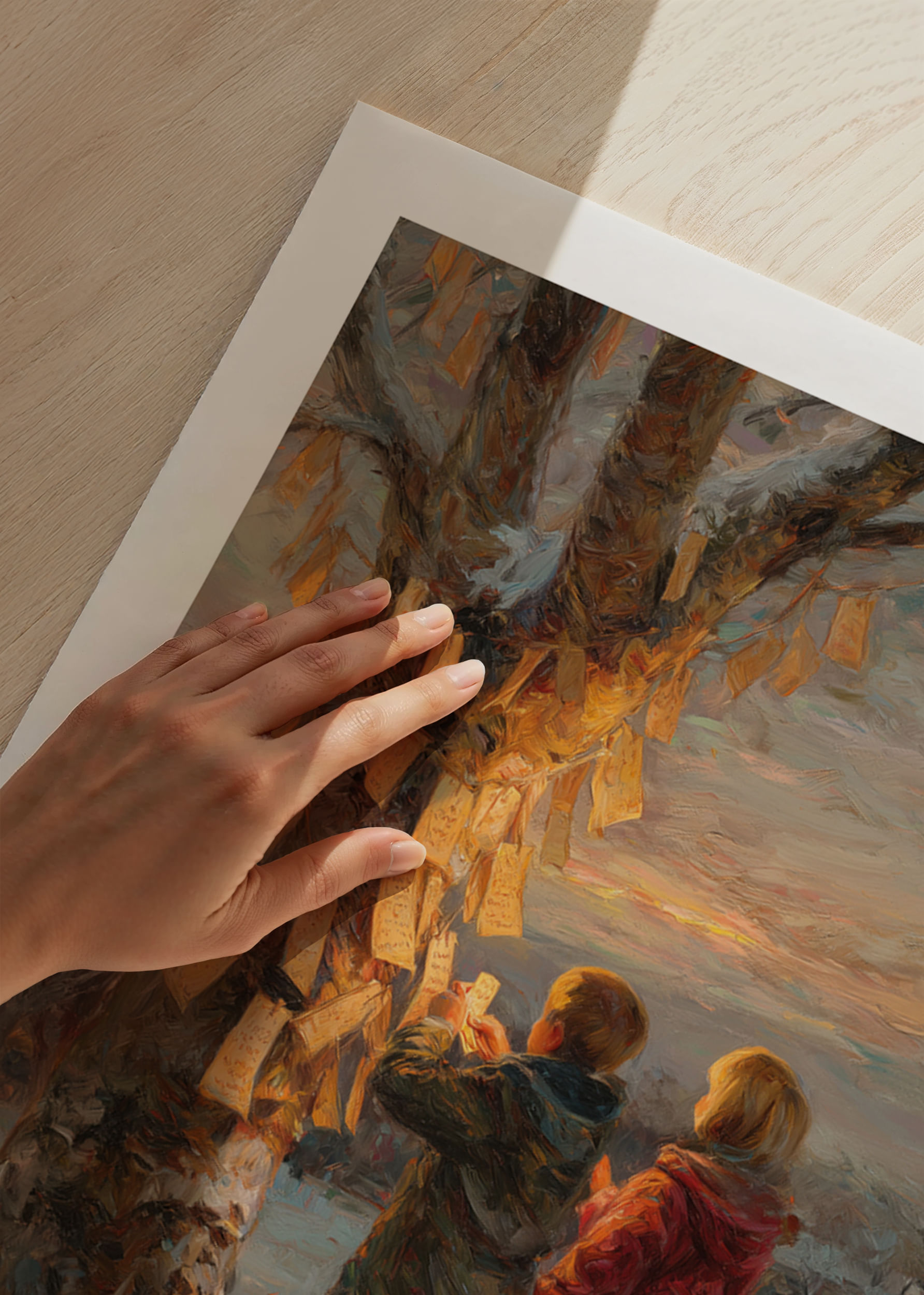Dos niños, junto a un árbol cubierto de nieve invernal brillante, escriben sus sueños en pequeñas notas doradas bajo la suave luz del atardecer. Este póster captura un momento mágico, con una cálida puesta de sol de fondo que impregna la escena de misterio y esperanza. Perfecto para añadir un toque de imaginación poética y encanto a cualquier habitación, crea una atmósfera inspiradora.
