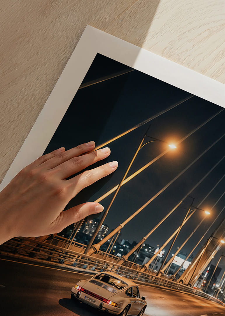 Este póster captura un Porsche 911 deslizándose elegantemente por un puente iluminado en el silencio de la noche. El cálido resplandor de las farolas crea una atmósfera casi cinematográfica donde la vibrante energía de la ciudad se fusiona con la tranquilidad del momento. El contraste entre movimiento y quietud le da al motivo una fuerte sensación de libertad y un estilo atemporal. Un póster perfecto para quienes desean añadir elegancia moderna y la cultura de los coches clásicos a su hogar.