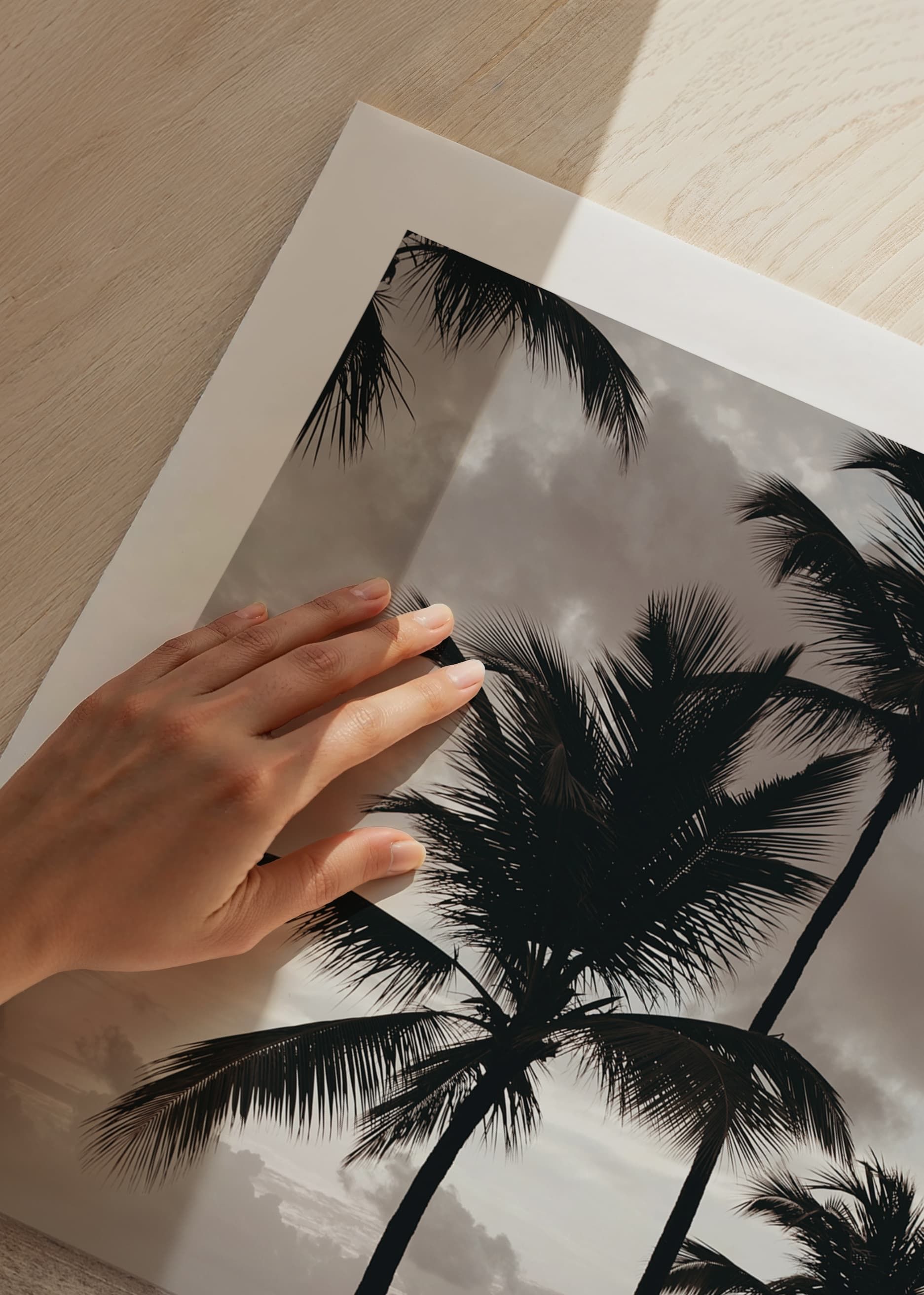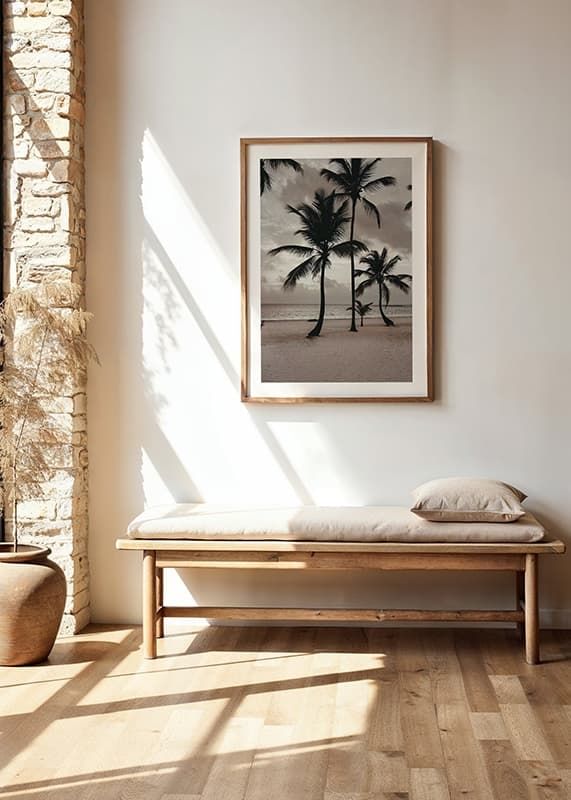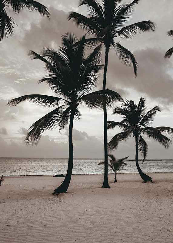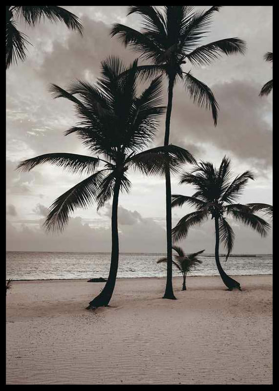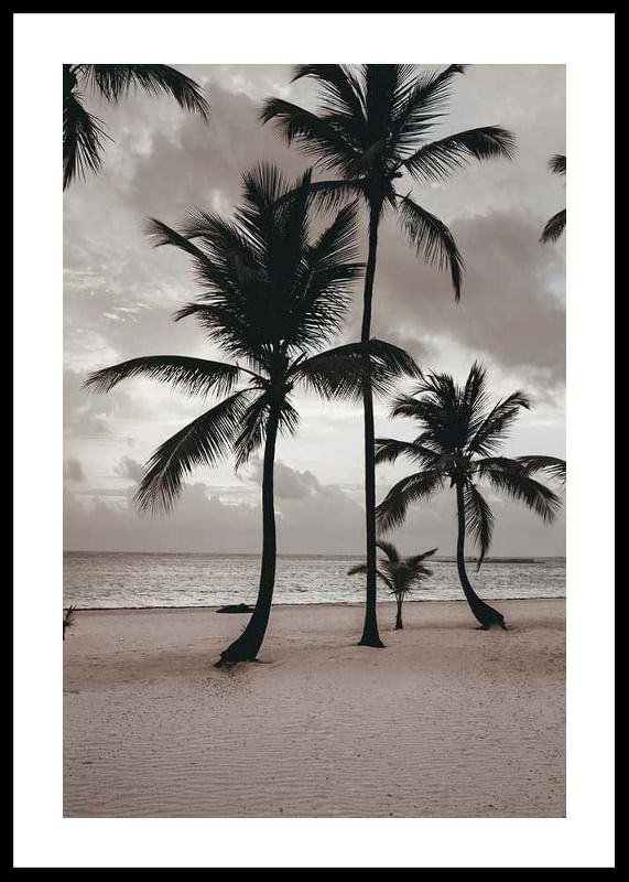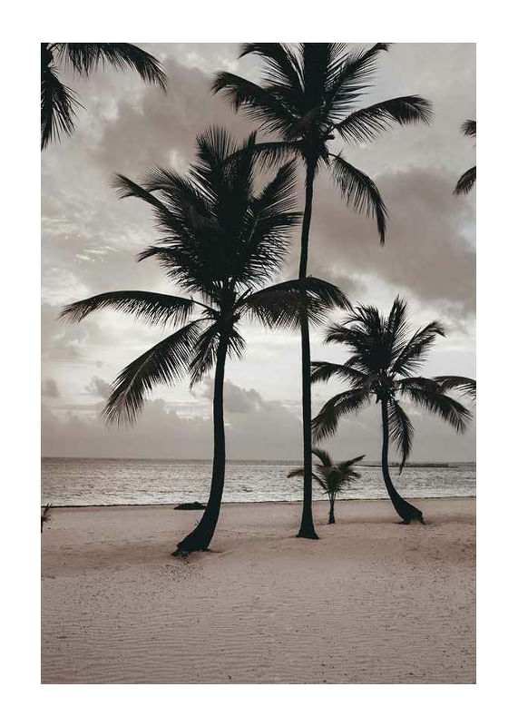 Varias palmeras altas se alzan sobre una amplia playa de arena con el mar de fondo y un cielo nublado y tenue. Predominan los tonos beige y grises apagados, que aportan al motivo una atmósfera serena. Este póster es ideal para habitaciones donde se busca crear un ambiente relajado y un sutil recuerdo de los ambientes tropicales.