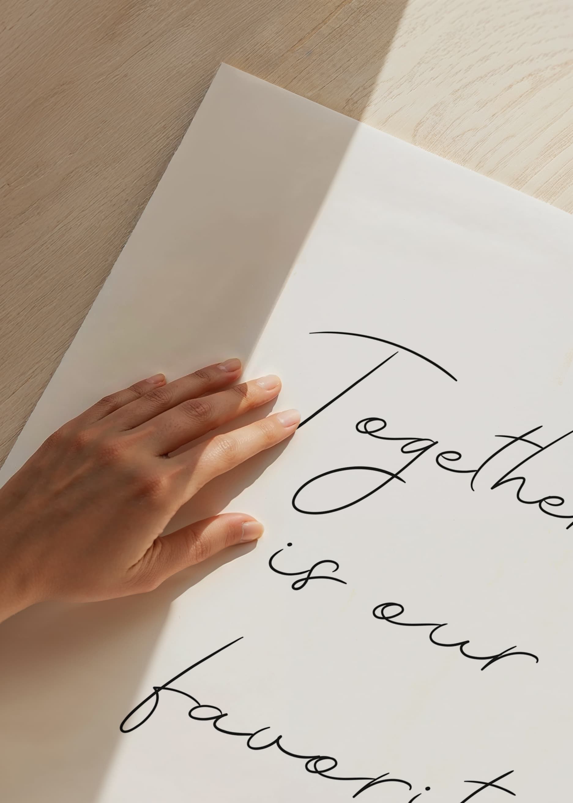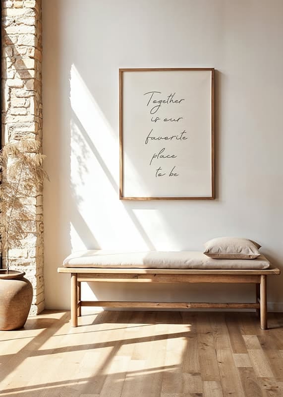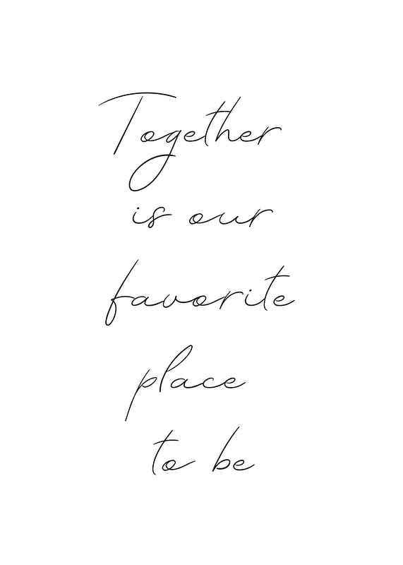 Un texto manuscrito en negro sobre fondo blanco forma el mensaje "Juntos es nuestro lugar favorito". El motivo presenta un estilo minimalista con una disposición diáfana de las palabras en secuencia vertical. Un póster que se integra tanto en la cocina como en la sala de estar y se convierte en un elemento discreto pero considerado en la pared de cuadros.
