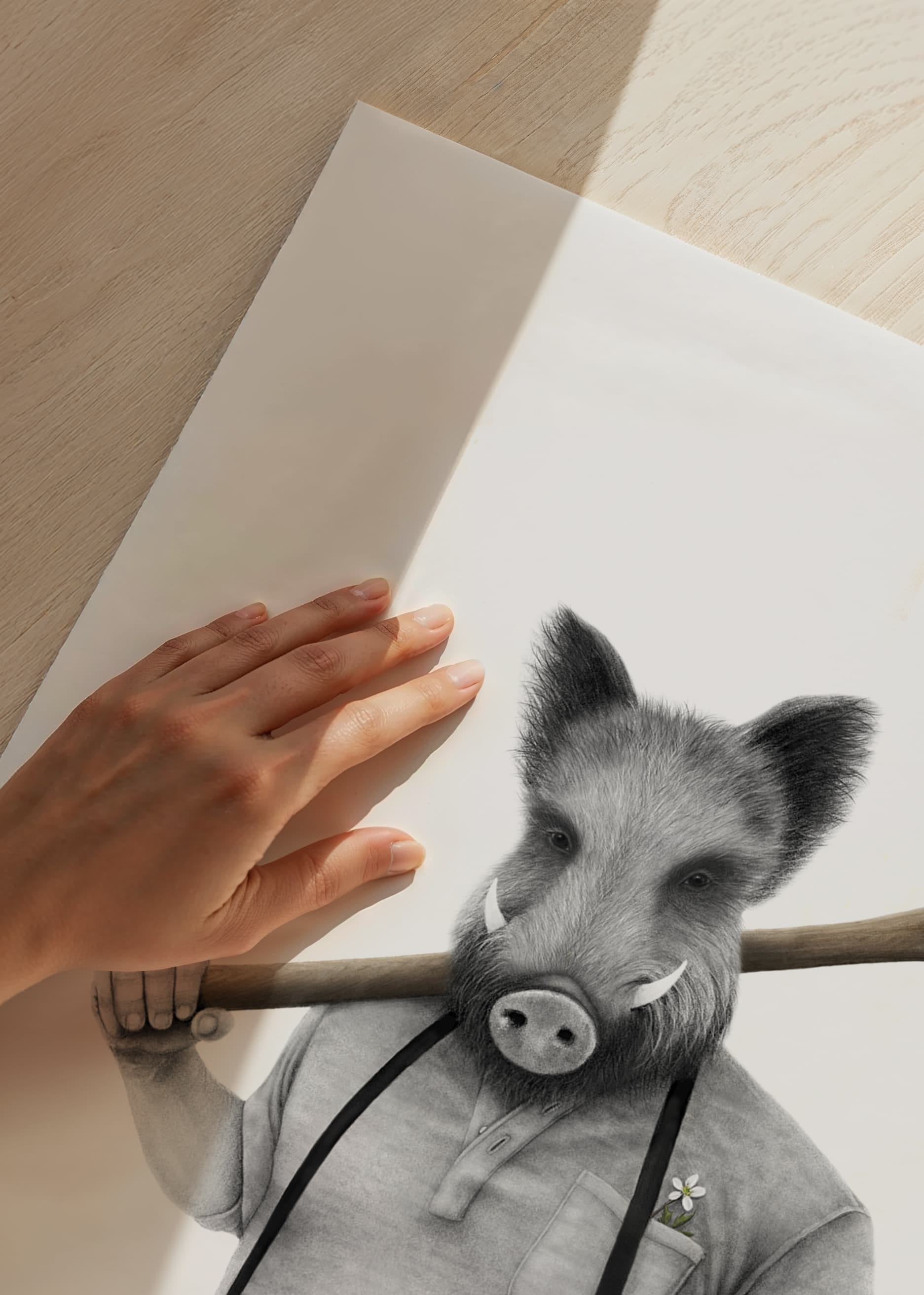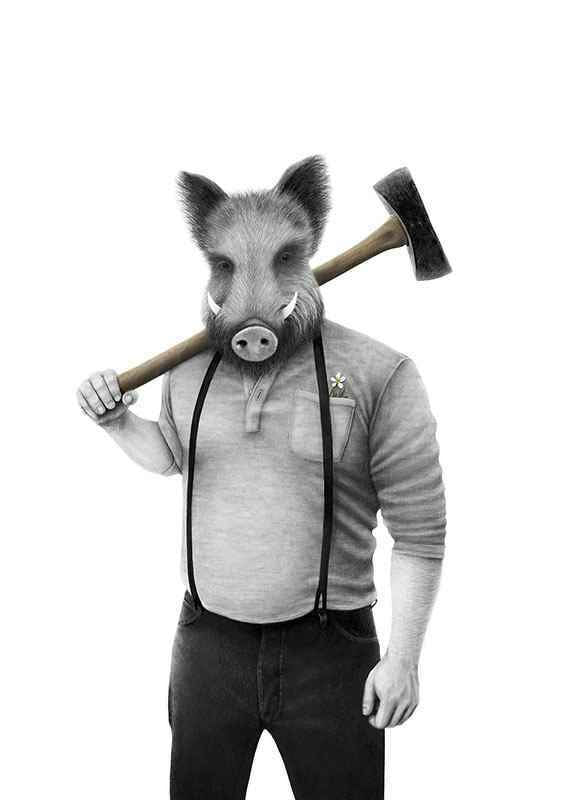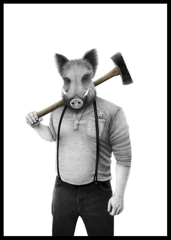 Una figura de jabalí de pie con cuerpo humano viste camisa, tirantes y pantalones oscuros. En una mano sostiene un gran mazo apoyado en el hombro y una pequeña flor sobresale del bolsillo del pecho. Los tonos blanco y negro y grises predominan en este póster de la ilustradora sueca Sanna Wieslander, conocida por su estilo detallado a lápiz y una interpretación lúdica de motivos clásicos donde el humor surrealista y el contraste entre lo cotidiano y la historia del arte se fusionan en una expresión contemporánea. Ideal para entornos modernos y lúdicos.