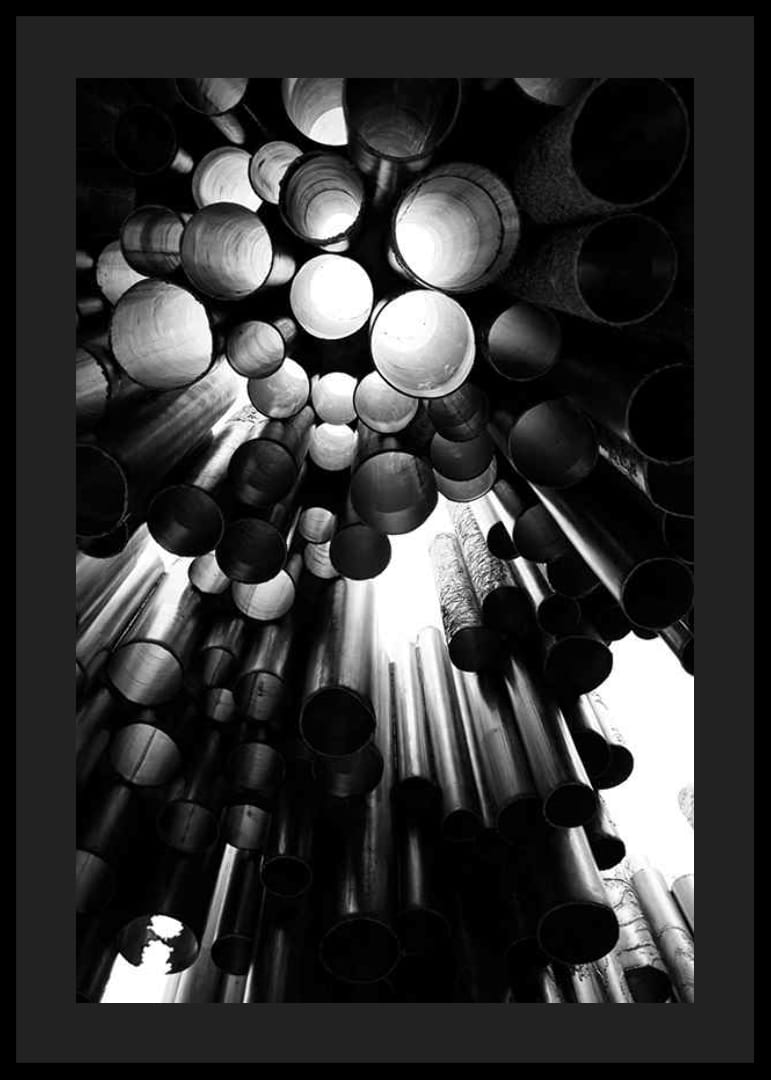 Tubos metálicos de diversos tamaños forman una estructura impactante y gráfica en el Monumento a Sibelus en Helsinki, Finlandia. La luz se filtra a través de las aberturas y crea emocionantes contrastes en blanco y negro. Este póster aporta un aire arquitectónico moderno y es ideal, por ejemplo, para salas de estar, pasillos u oficinas.