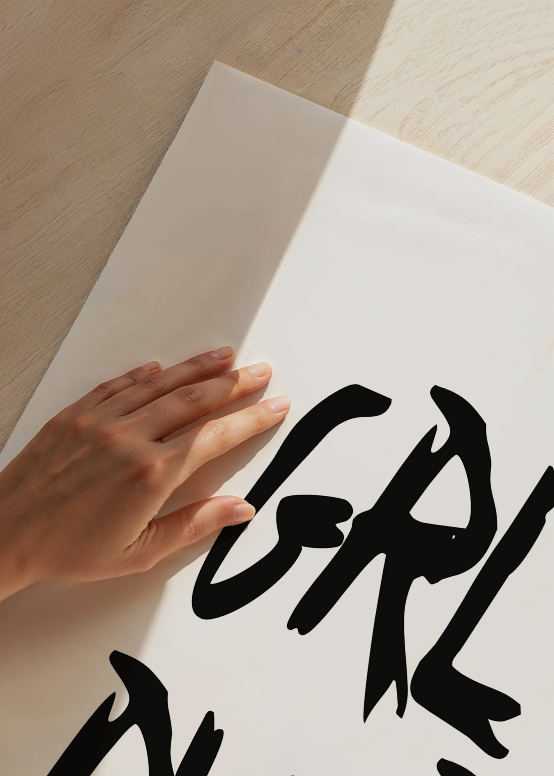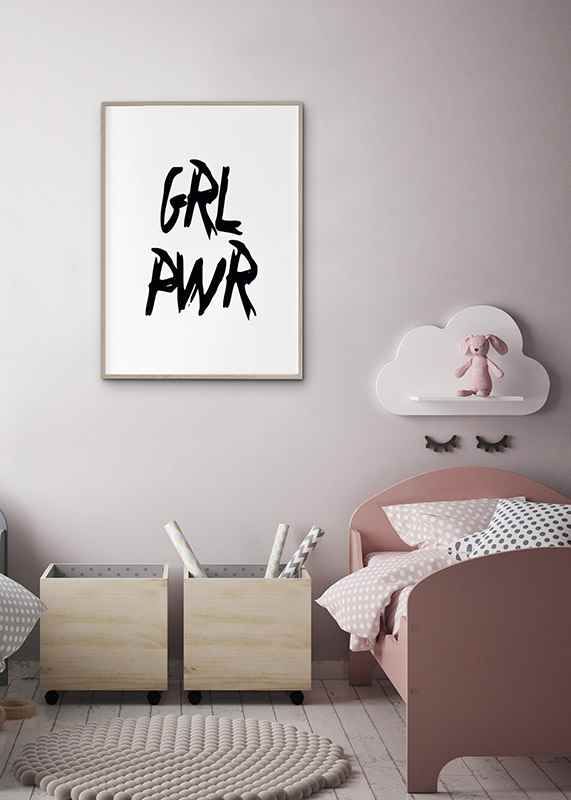 El motivo consiste en las palabras GRL PWR escritas a mano en negro con líneas potentes sobre un fondo completamente blanco. El diseño minimalista y gráfico ofrece una expresión clara. Un póster que aporta energía y claridad a la habitación de un niño, a su lugar de trabajo o a su pasillo, y crea un ambiente inspirador con su mensaje sencillo.