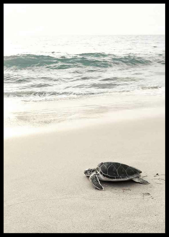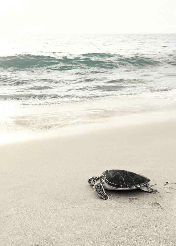 Una tortuga marina solitaria se mueve lentamente por la arena clara, casi blanca, hacia un mar en calma. Las suaves olas crean movimiento en el fondo y los colores serenos del motivo transmiten una sensación de relajación. Este póster es ideal para habitaciones donde se busca un ambiente natural y veraniego.