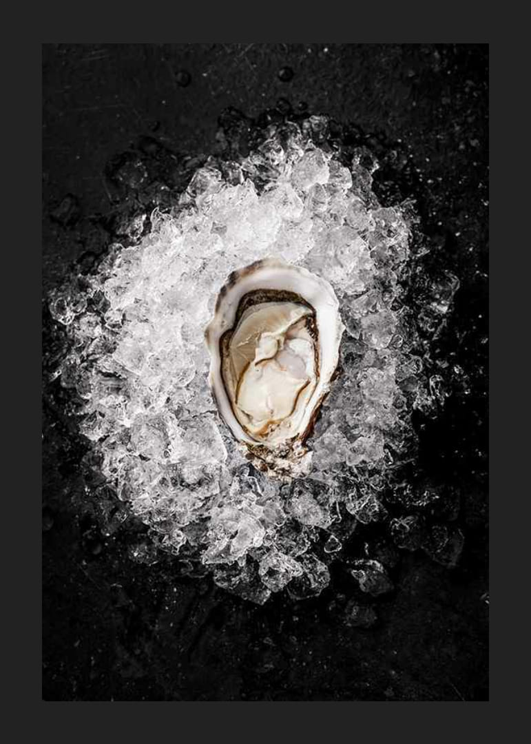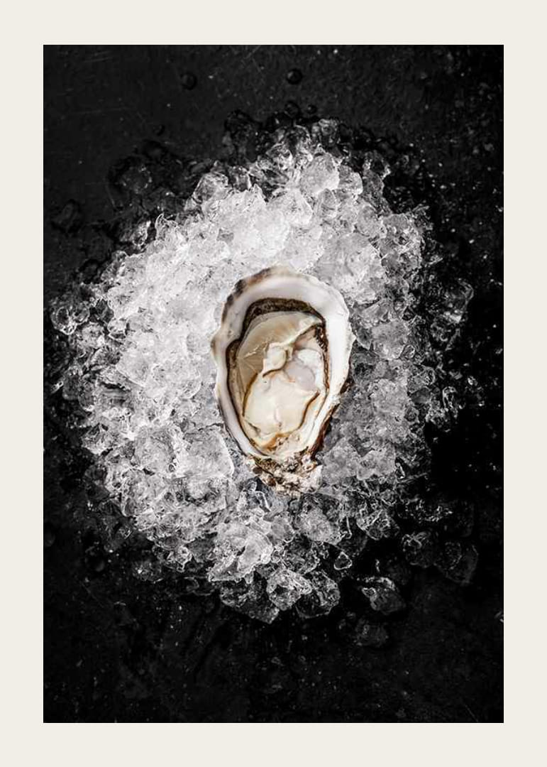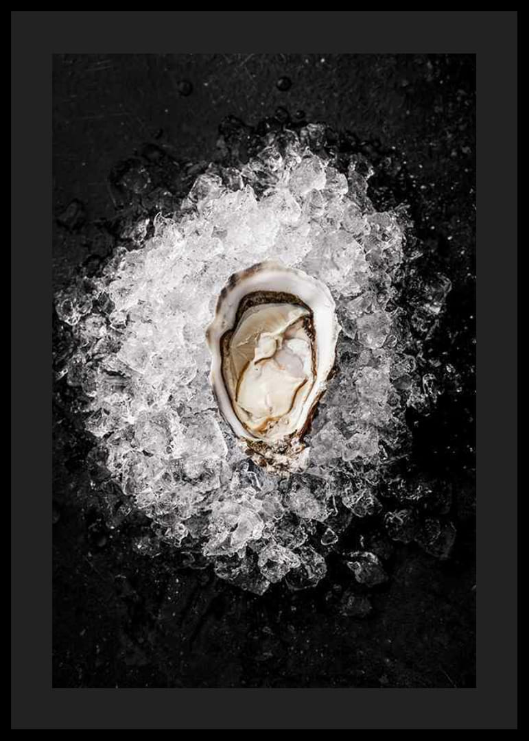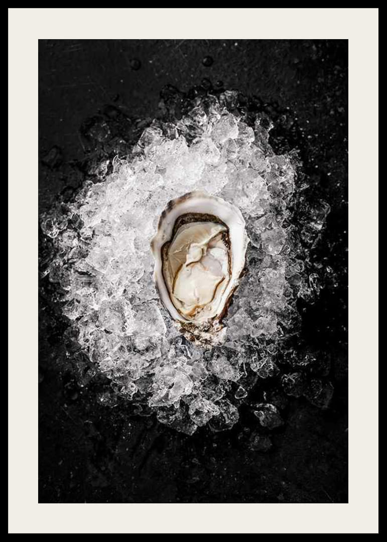 Primer plano de una ostra sobre hielo picado. El marcado contraste entre los brillantes cubitos de hielo y la superficie oscura enmarca el motivo. La concha y el suave interior de la ostra se capturan con gran nitidez. Este póster ofrece un toque moderno y queda perfecto en la cocina o el comedor.