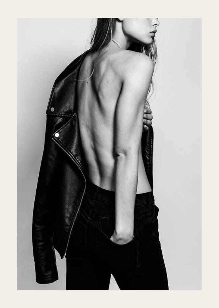 Perfil de una joven con vaqueros negros, torso desnudo y una chaqueta de cuero colgando despreocupadamente sobre un hombro. El contraste entre la piel clara y la ropa oscura le da al póster un aire atemporal y moderno. Un póster que encaja a la perfección tanto en dormitorios como en salones modernos donde la moda y la actitud son protagonistas.