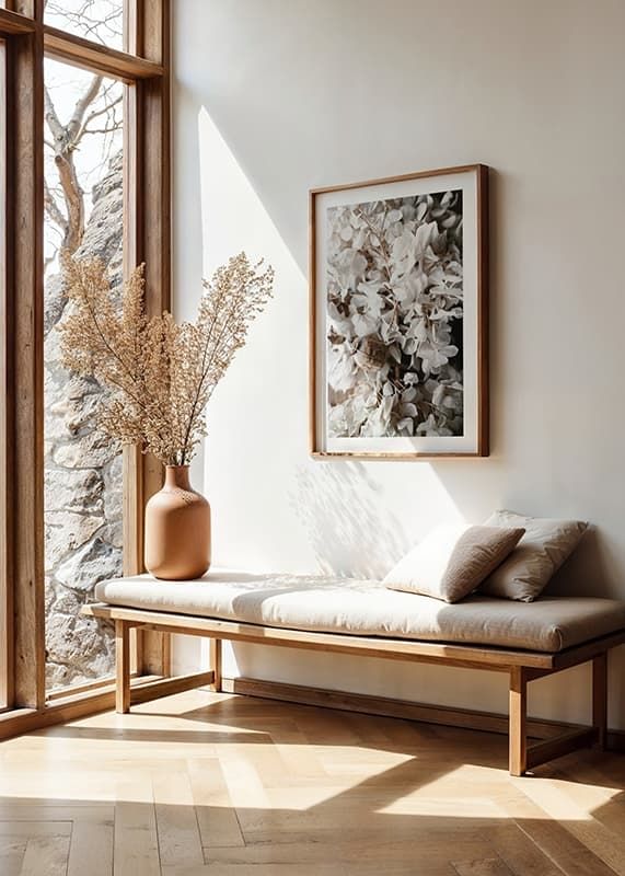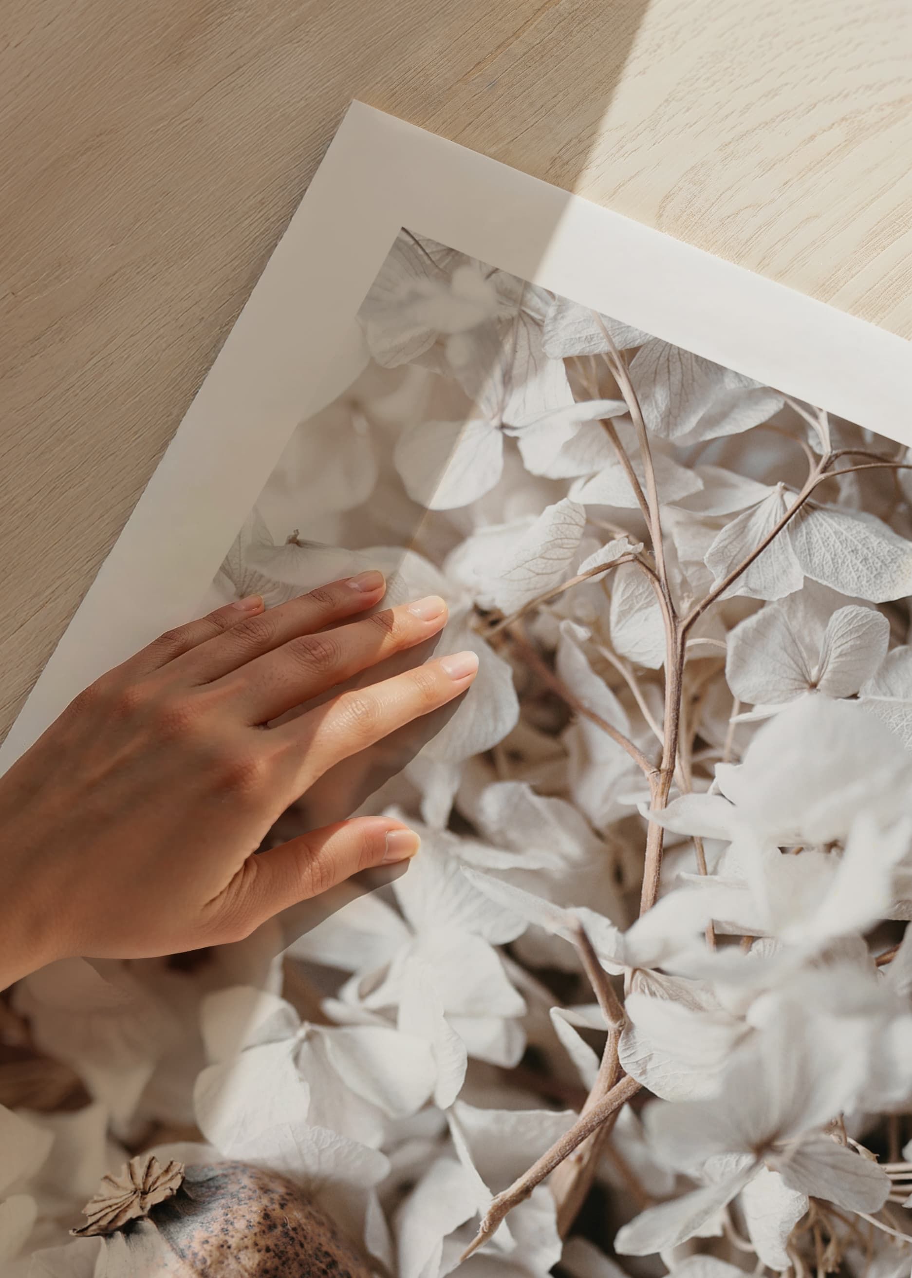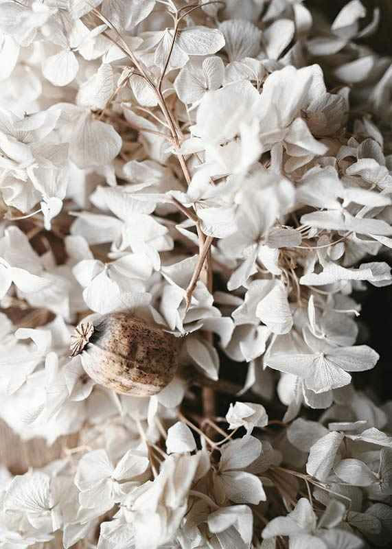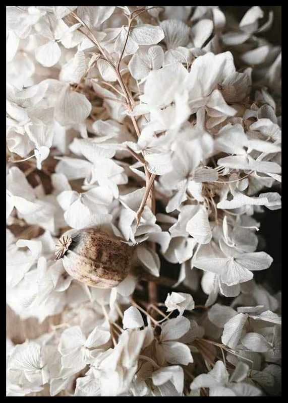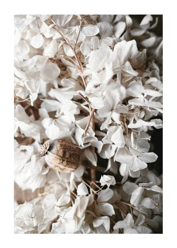 Primer plano de flores secas de hortensia en tonos beige y blanco suaves. En el centro de la imagen, se aprecia una vaina que aporta un sutil toque otoñal. La paleta de colores naturales hace que este póster botánico sea fácil de combinar con otros motivos y aporta una elegancia discreta a una sala de estar o un dormitorio.