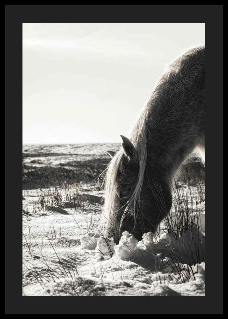 Se ve el perfil de un caballo con una larga crin mientras busca alimento entre la nieve y la hierba helada. El paisaje invernal se extiende al fondo con una suave luz natural y un horizonte sereno. Los tonos apagados crean una expresión natural. Este póster transmite una atmósfera serena y estacional y es ideal tanto para salas de estar como para pasillos.