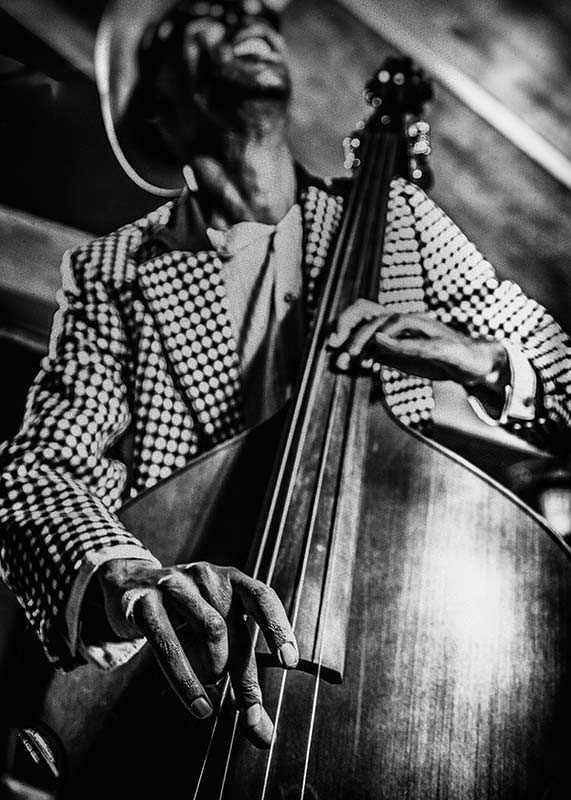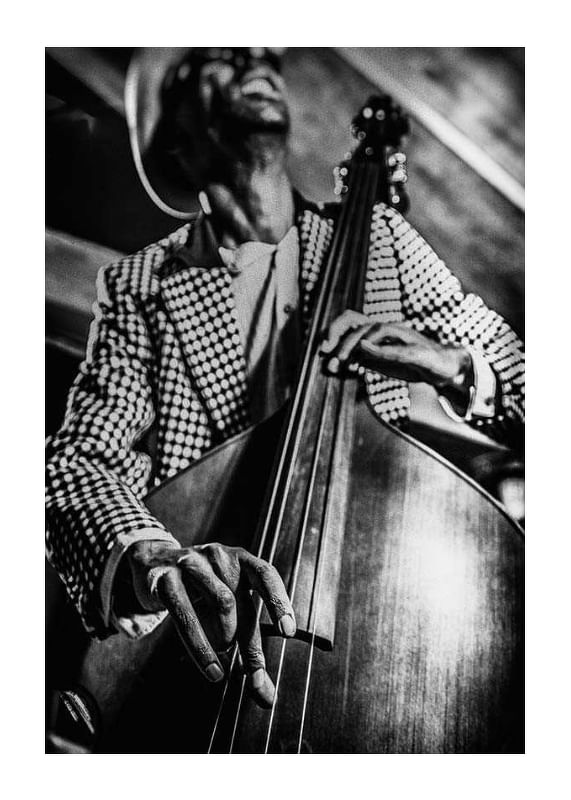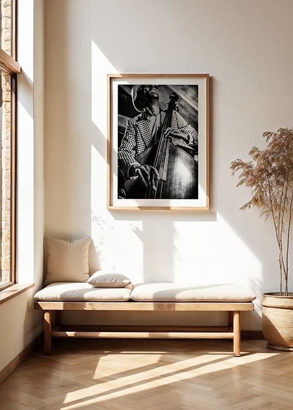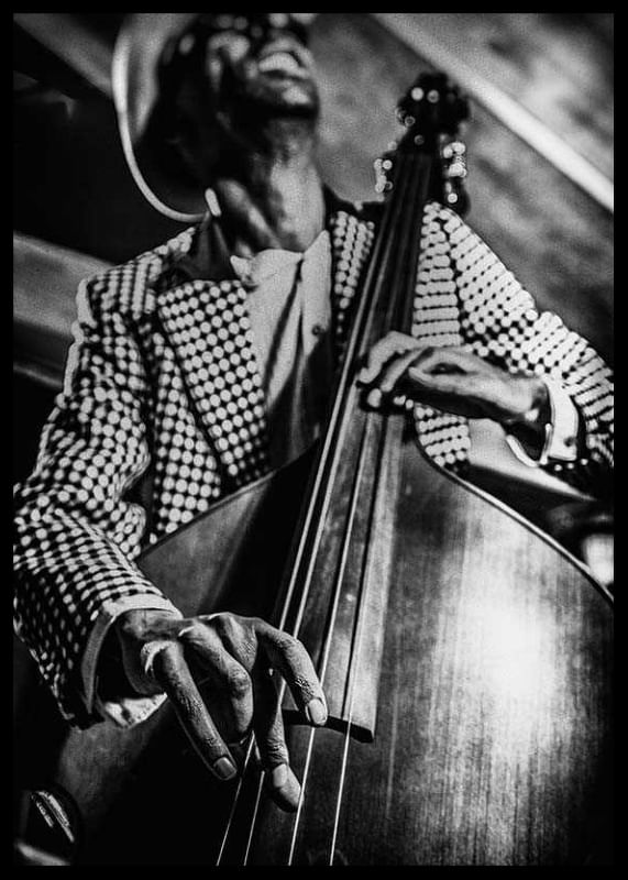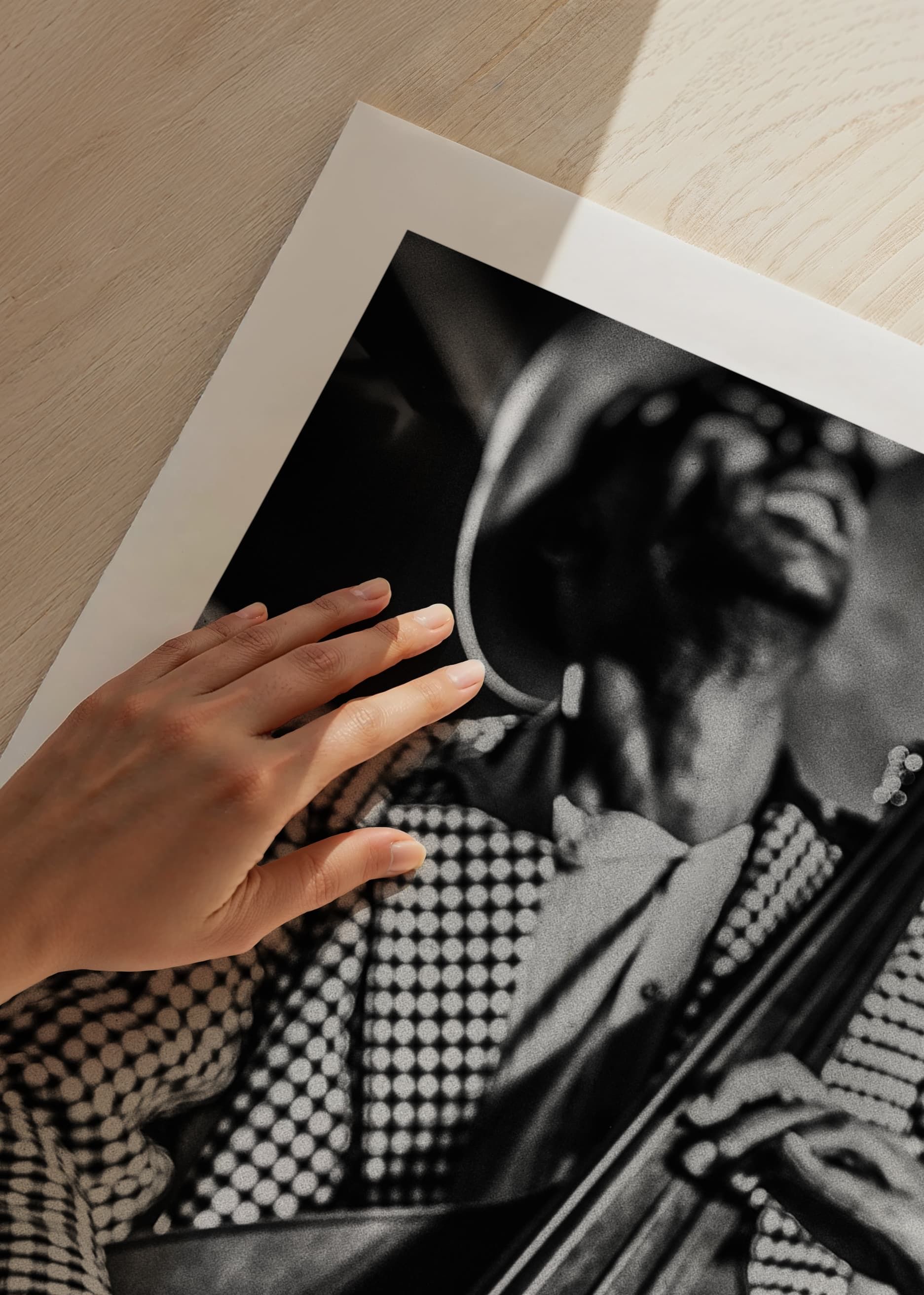 Primer plano de un músico con chaqueta y sombrero a cuadros tocando el contrabajo, con un fuerte enfoque en la mano y las cuerdas del instrumento. La fotografía en blanco y negro captura la alegría de la música y un aire vintage, convirtiendo este póster en un elemento elegante para las paredes de salas de música y salones.