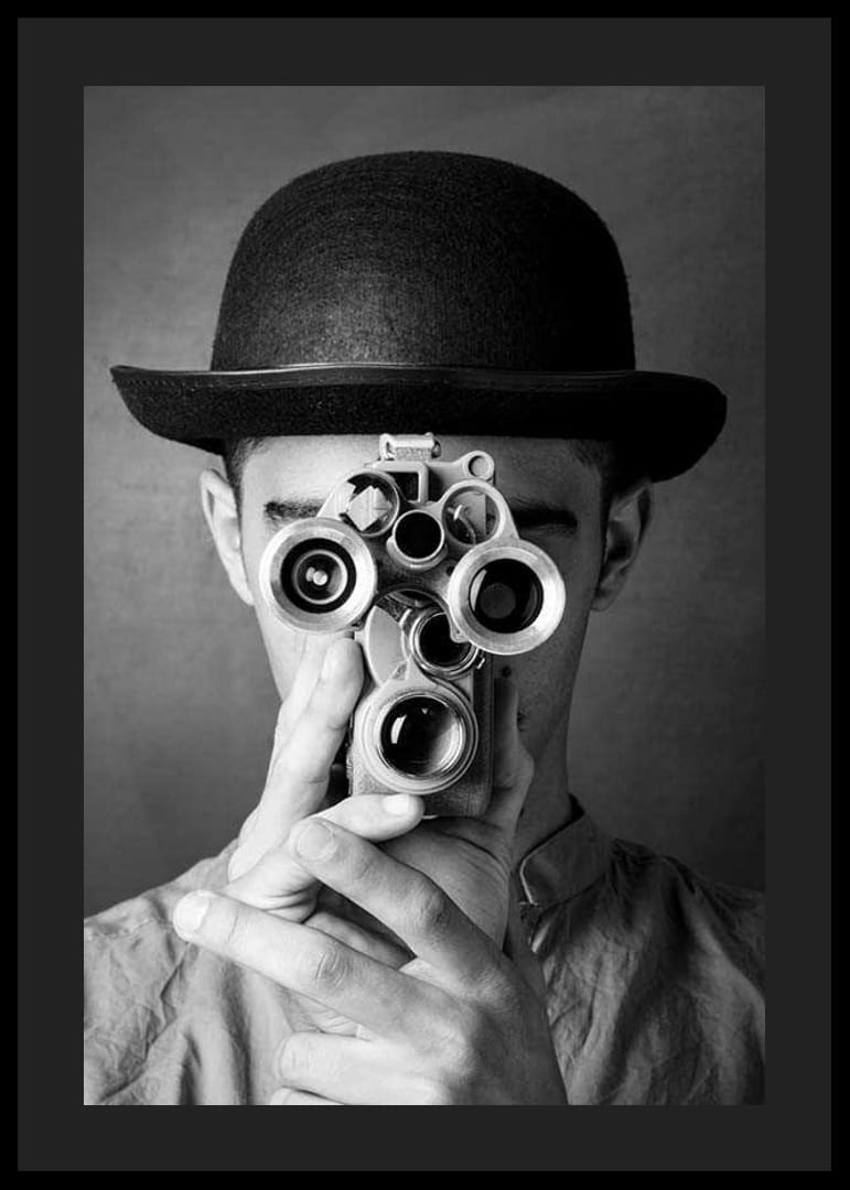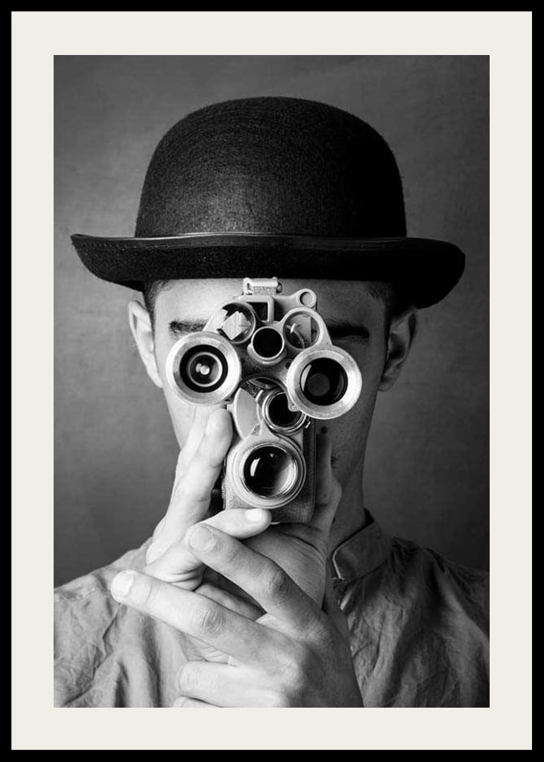Primer plano de un joven con sombrero redondo sosteniendo una cámara antigua de película multiobjetivo frente a su rostro. Los contrastes en blanco y negro resaltan los detalles tanto de la cámara como del sombrero. Este póster tiene un aire atemporal y aporta un toque vintage a un estudio o sala de estar.