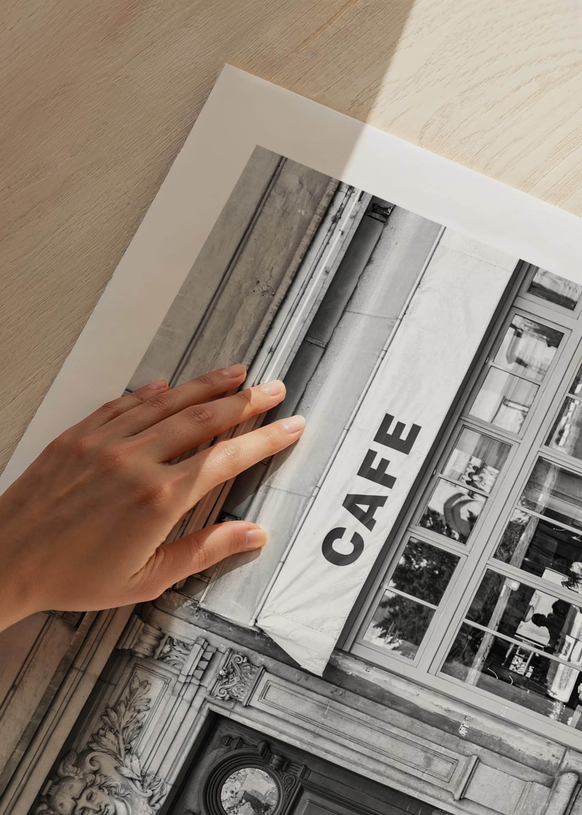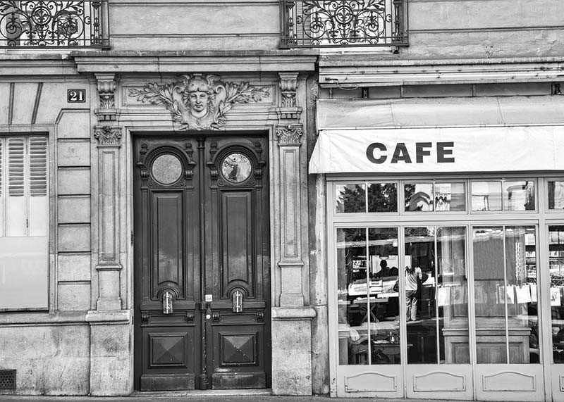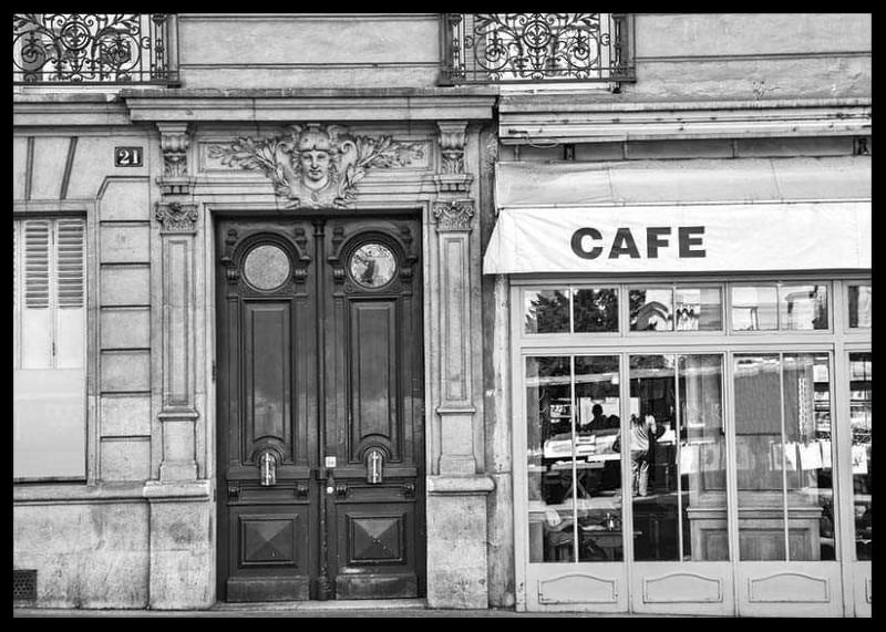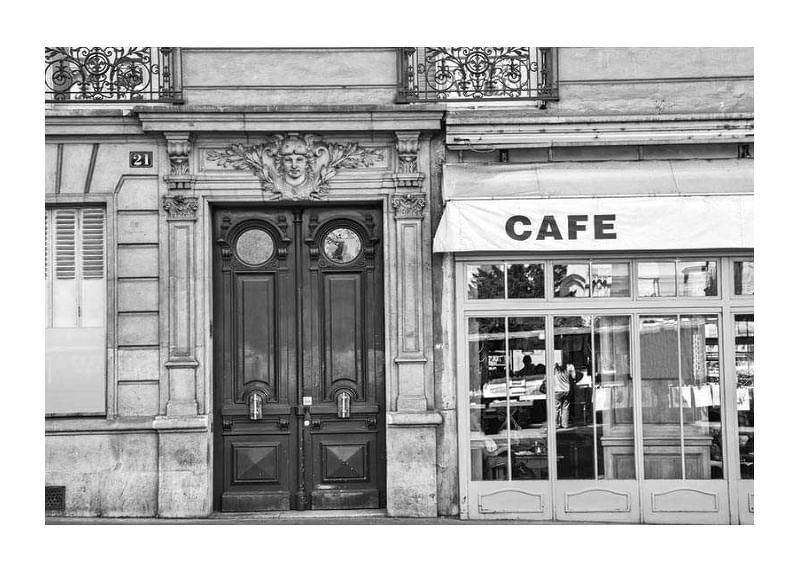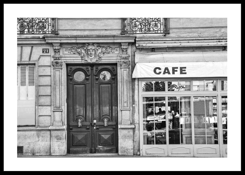 Una fachada con portones dobles y mampostería, junto a los amplios ventanales de una cafetería, es el centro de atención de esta fotografía en blanco y negro. El cristal refleja la vida urbana exterior, mientras que la inscripción «CAFE» es claramente visible en el toldo. Este póster tiene un aire atemporal y quedaría perfecto en una cocina, un salón o un comedor.