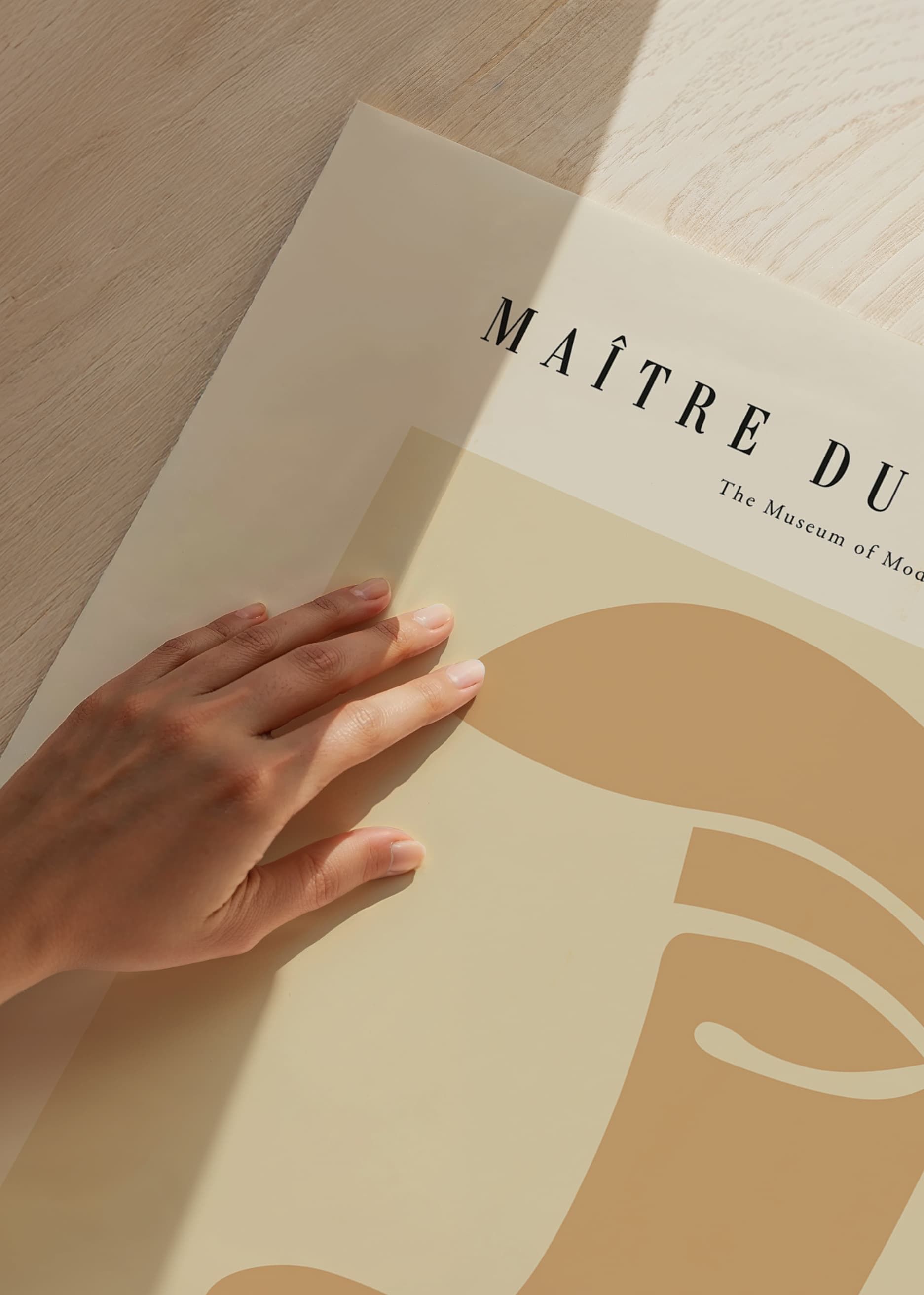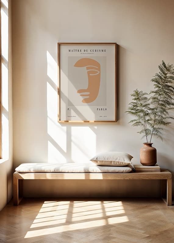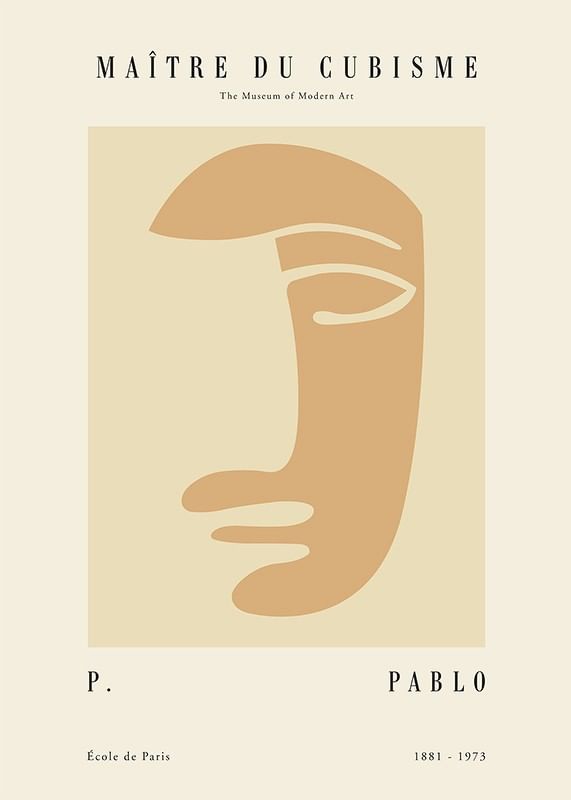 El motivo consiste en un rostro cubista estilizado dibujado con líneas y formas sencillas en cálidos tonos arena y beige. Inspirado en la estética distintiva de Pablo Picasso, crea una atmósfera gráfica y moderna. Este póster añade un toque artístico a tu sala de estar o estudio sin acaparar toda la habitación.