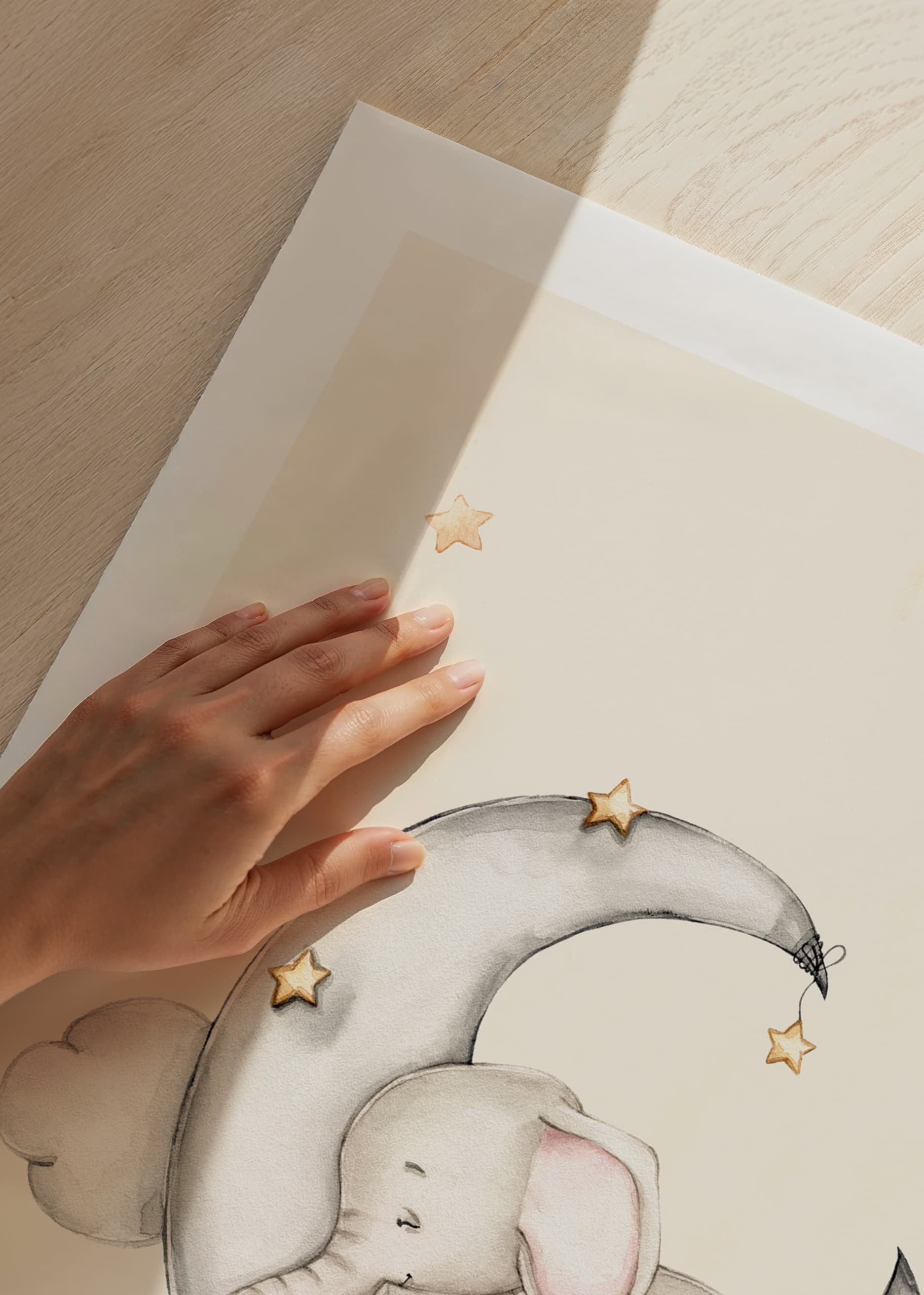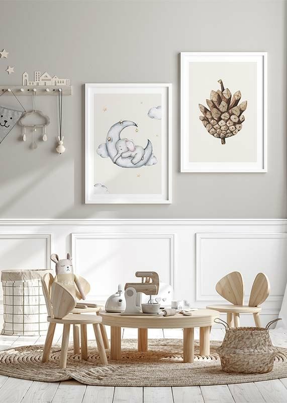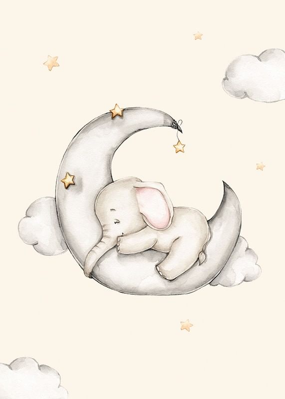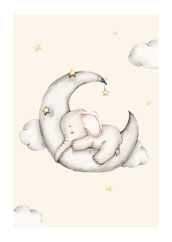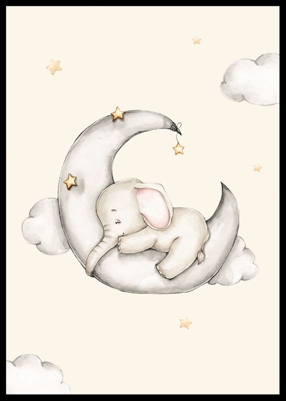 Un pequeño elefante duerme sobre una luna creciente gris, rodeado de suaves nubes y estrellas amarillas. Los tonos arena claros y grises se combinan con el rosa tenue de las orejas del elefante, creando una atmósfera de paz. Este póster infantil queda perfecto en una habitación infantil o en un acogedor rincón de lectura.