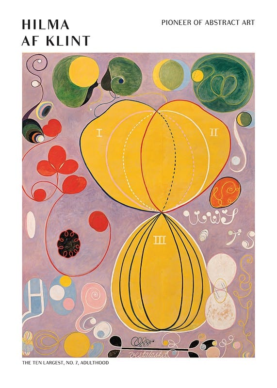 El número 7 de "Los diez más grandes" fue pintado por la artista sueca Hilma af Klint en 1907. Grandes formas de color amarillo anaranjado dominan el motivo, rodeadas de círculos y líneas en verde, rojo y blanco sobre un fondo morado. Los números I, II y III aparecen en el centro. La obra pertenece a la serie "Los diez más grandes" y es un ejemplo del arte abstracto sueco pionero, donde el estilo característico de Hilma af Klint y su simbolismo espiritual le otorgan una presencia artística y lo convierten en un elemento interesante en los hogares modernos.